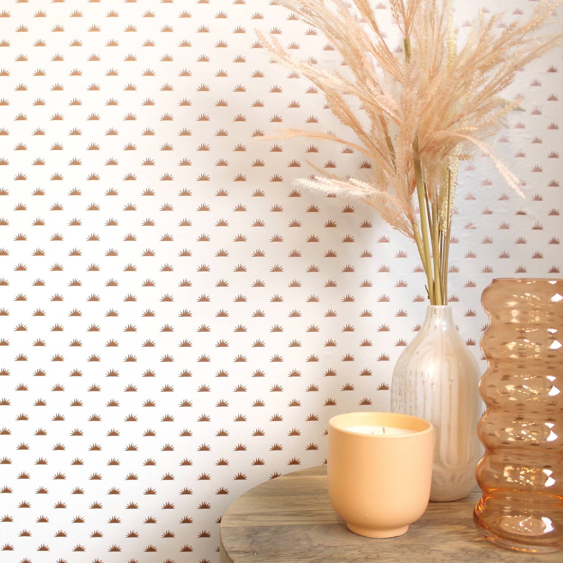 Elevate your home with our mini Sunbeam peel and stick wallpaper in a stunning sunbaked metallic copper hue on a white background. Featuring a Mid-Century modern design, these radiant sun motifs add warmth and style to bedrooms, bathrooms, kitchens, and entryways. Try it on a ceiling for an unexpected look! Easy to apply—just peel, place, and transform your space. These retro-inspired sunbeams will infuse your home with a cozy, sunlit glow and endless design possibilities.