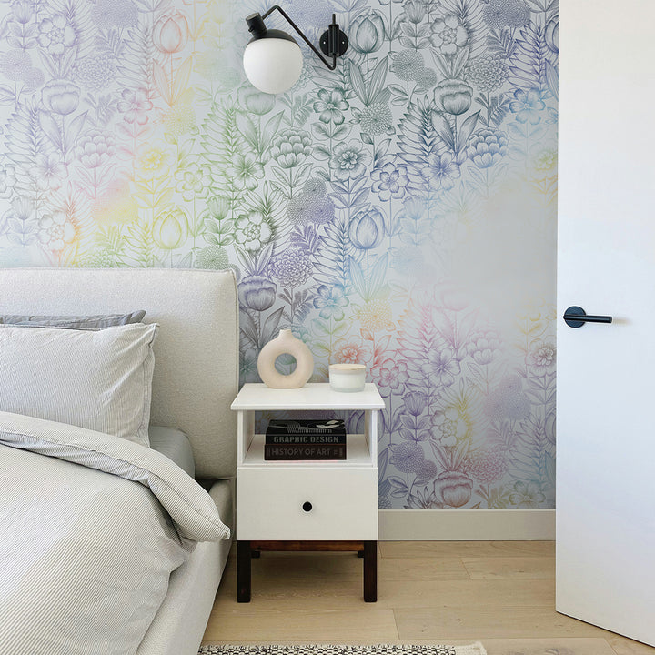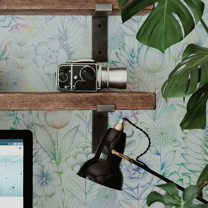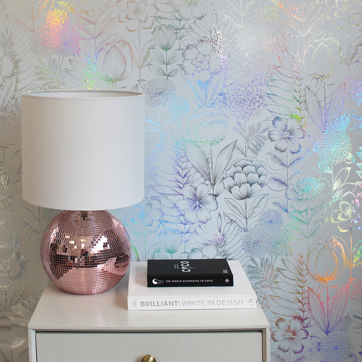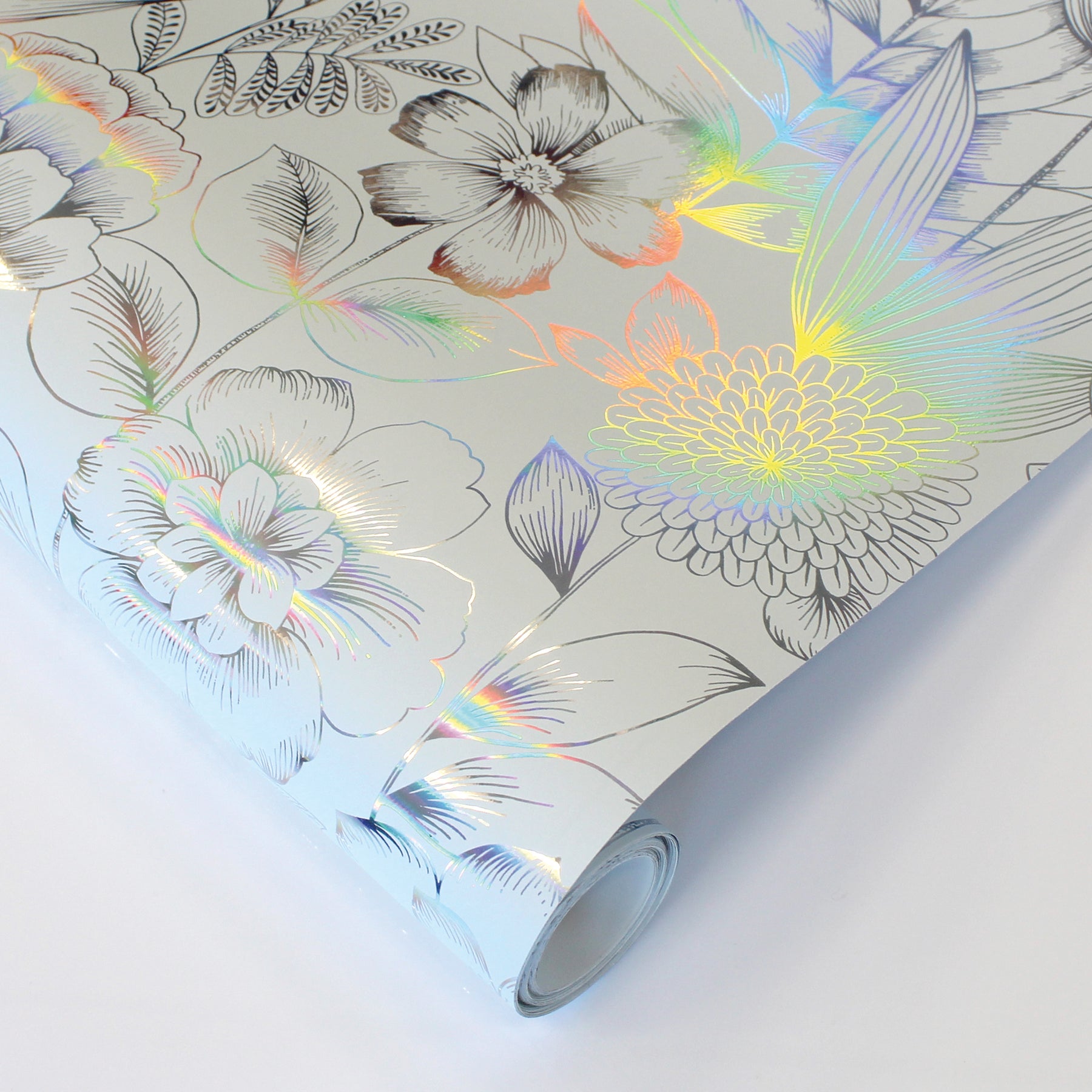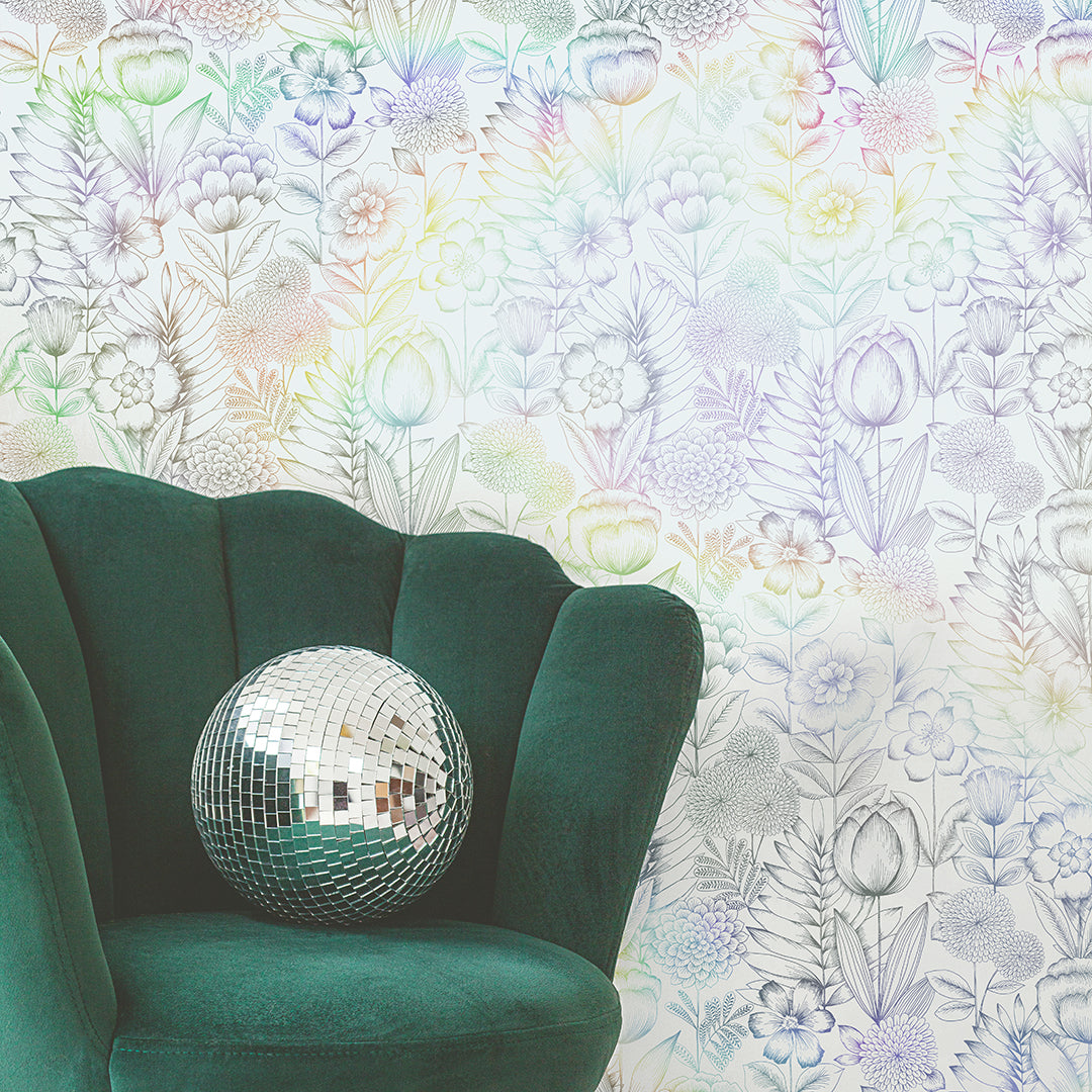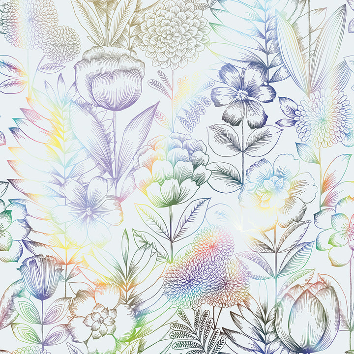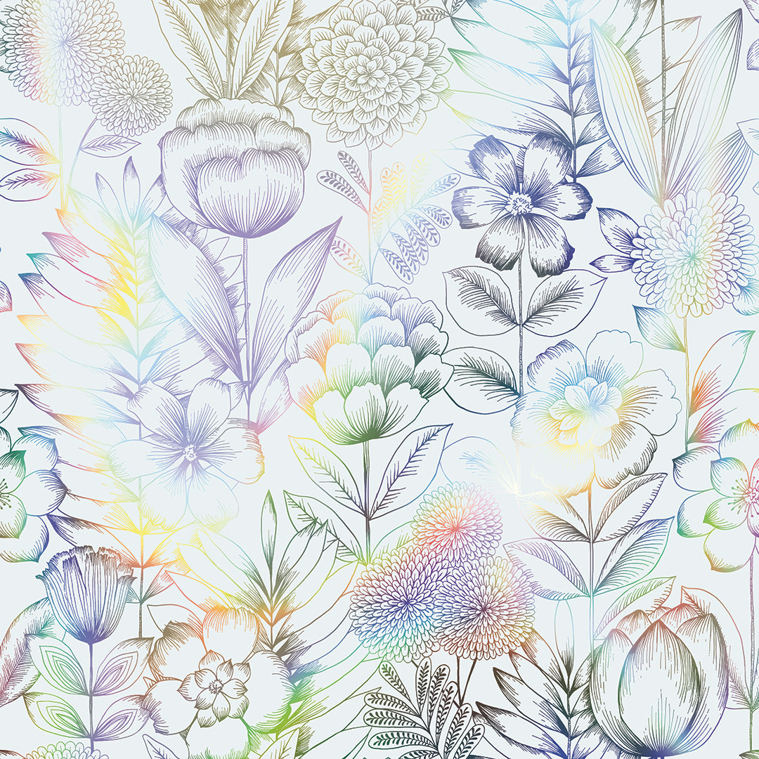 Create a sense of rural escapism with our White and Silver Holographic Homestead Floral Peel and Stick Wallpaper. Romantic with a bit of flair, this design features delicate, hand-drawn blooms that shimmer against a rainbow holographic finish, adding richness and movement to your space. The soft, vintage florals create a beautiful statement in bedrooms, powder rooms, or any area looking for standout character.