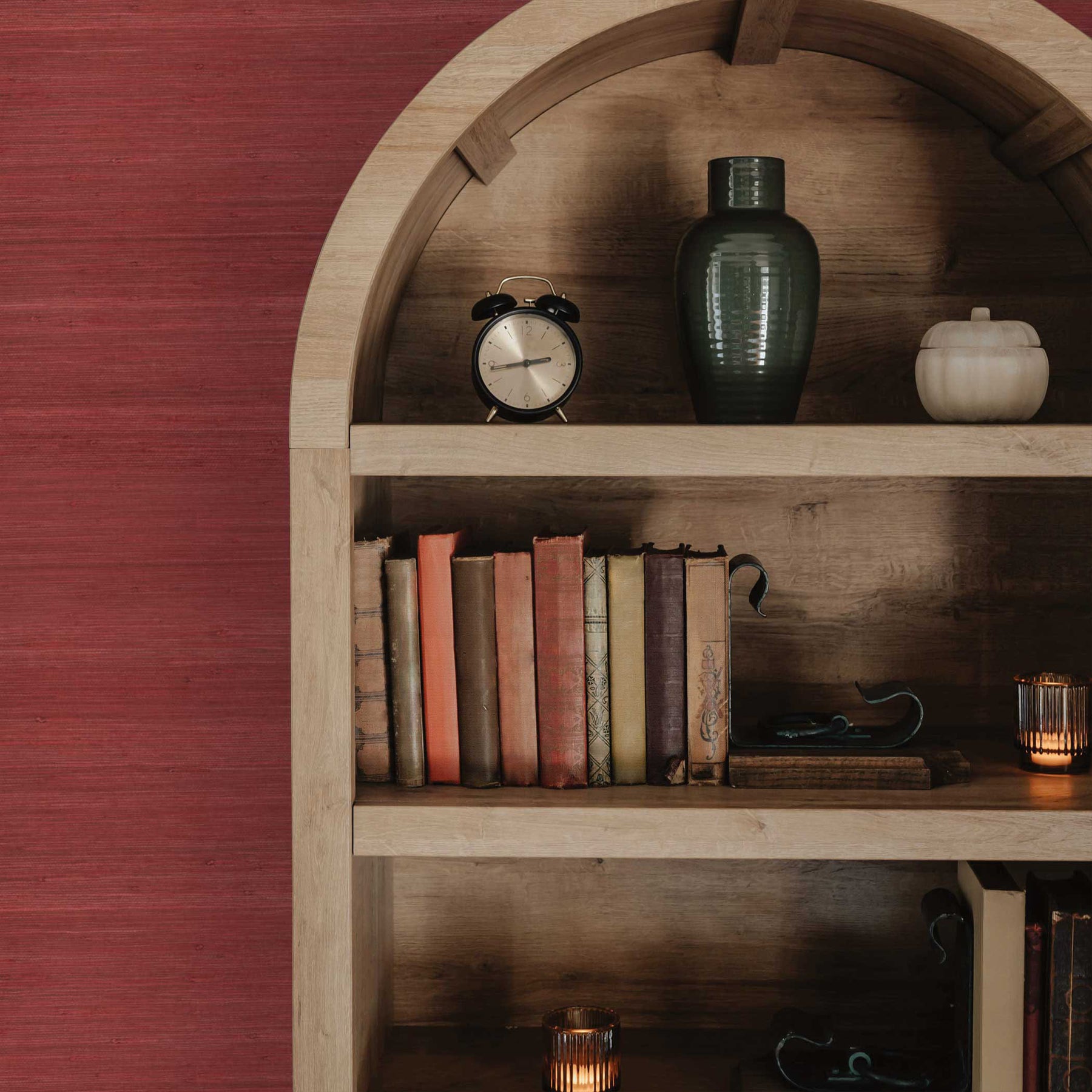 Available in five color options including two neutral colorways, dark wheat, aqua green or a deep crimson red,, this unpasted wallpaper will make a statement and elevate living rooms, bedrooms, hallways, dining areas, or office spaces. Its structured weave and refined textural finish make it a versatile choice that fits easily within contemporary, coastal, transitional, and modern decors.