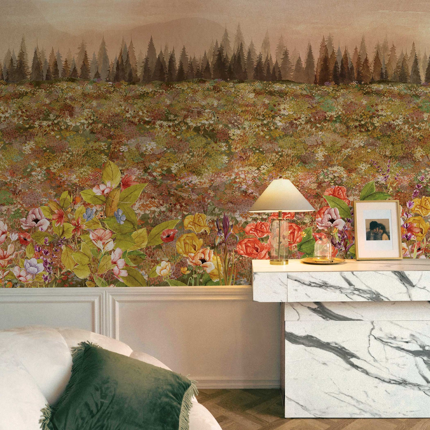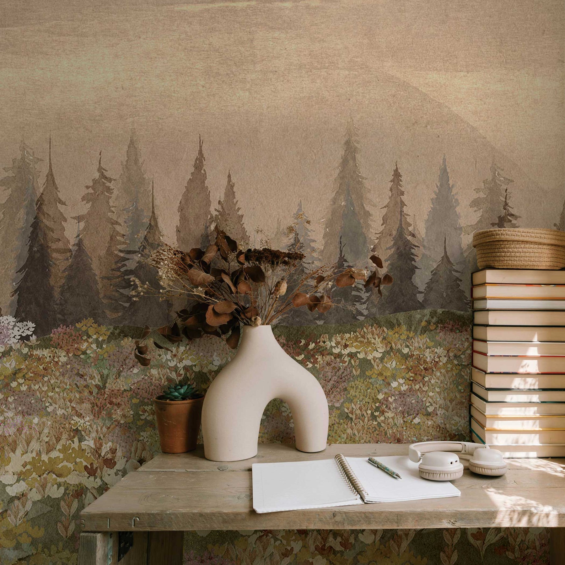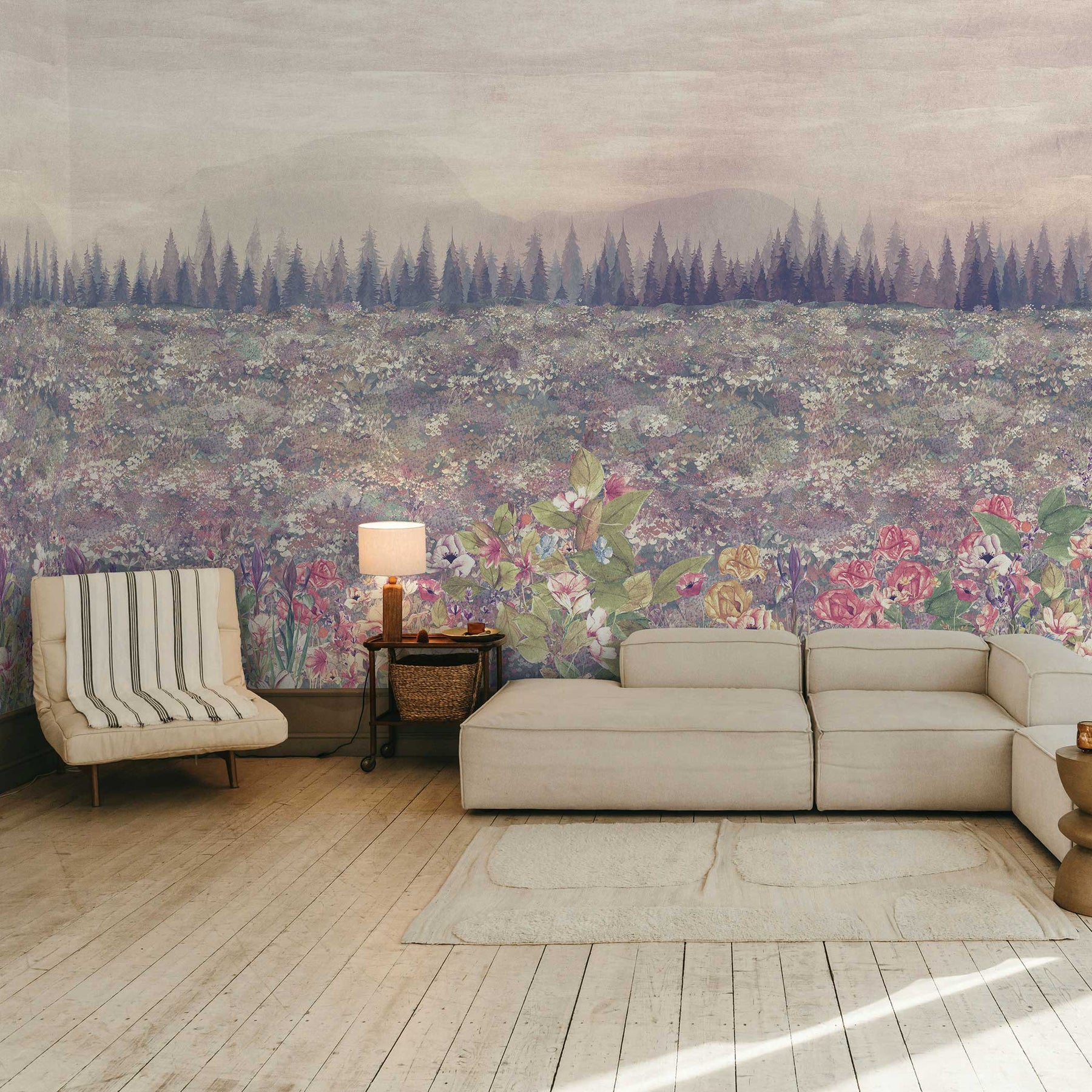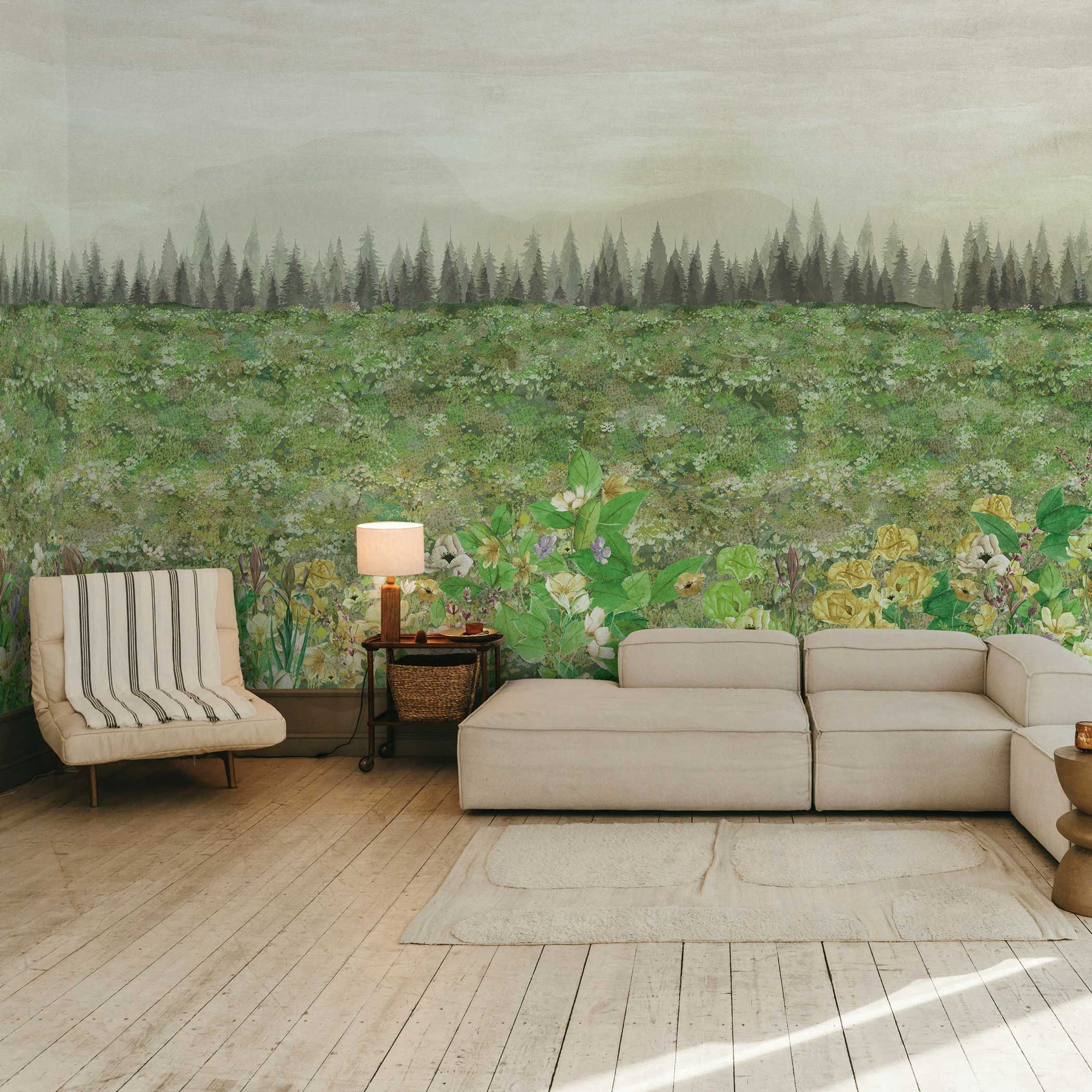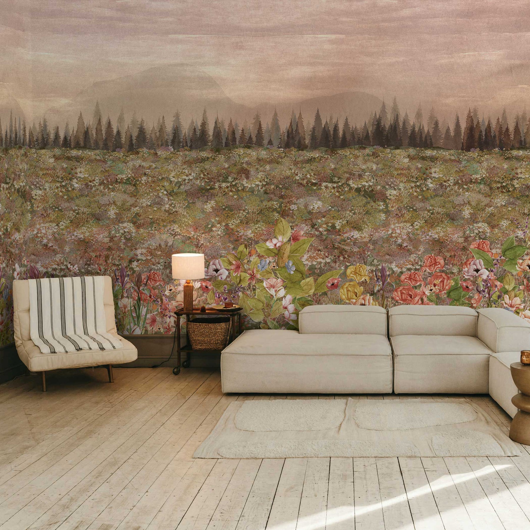 This scenic wall mural captures the serene beauty of a wildflower meadow stretching toward distant mountains and framed by tall evergreen trees. Soft painterly strokes and watercolor tones create a quiet escape that feels both grounded and dreamlike. Applied as a peel and stick wall mural, Wildflower Horizon envelops the room in vivid color and the natural rhythm of an artistic landscape.