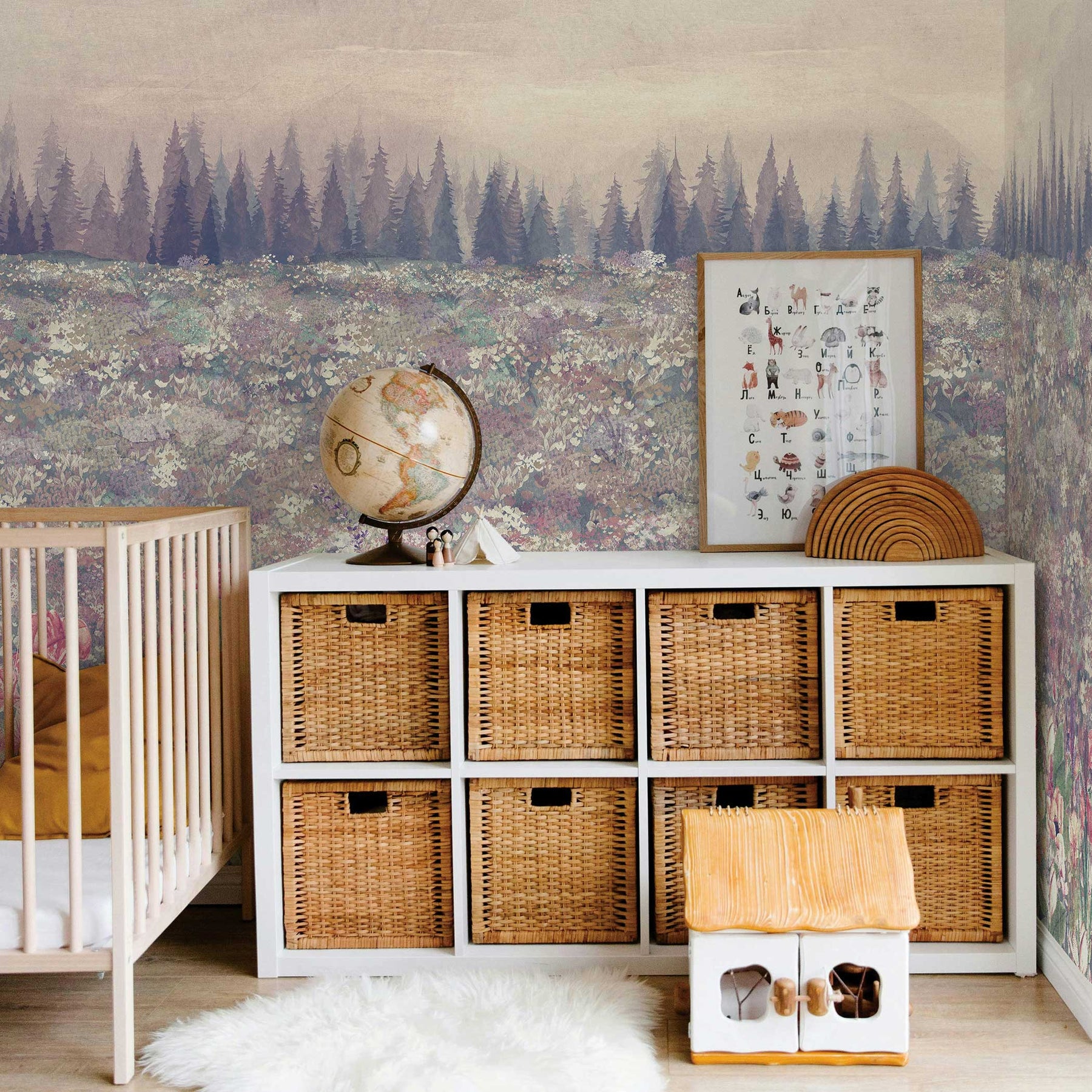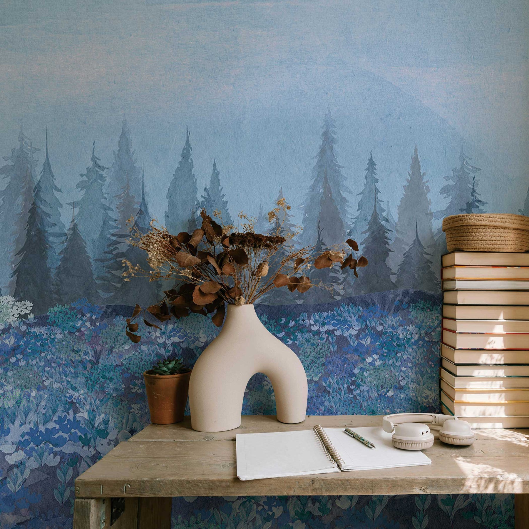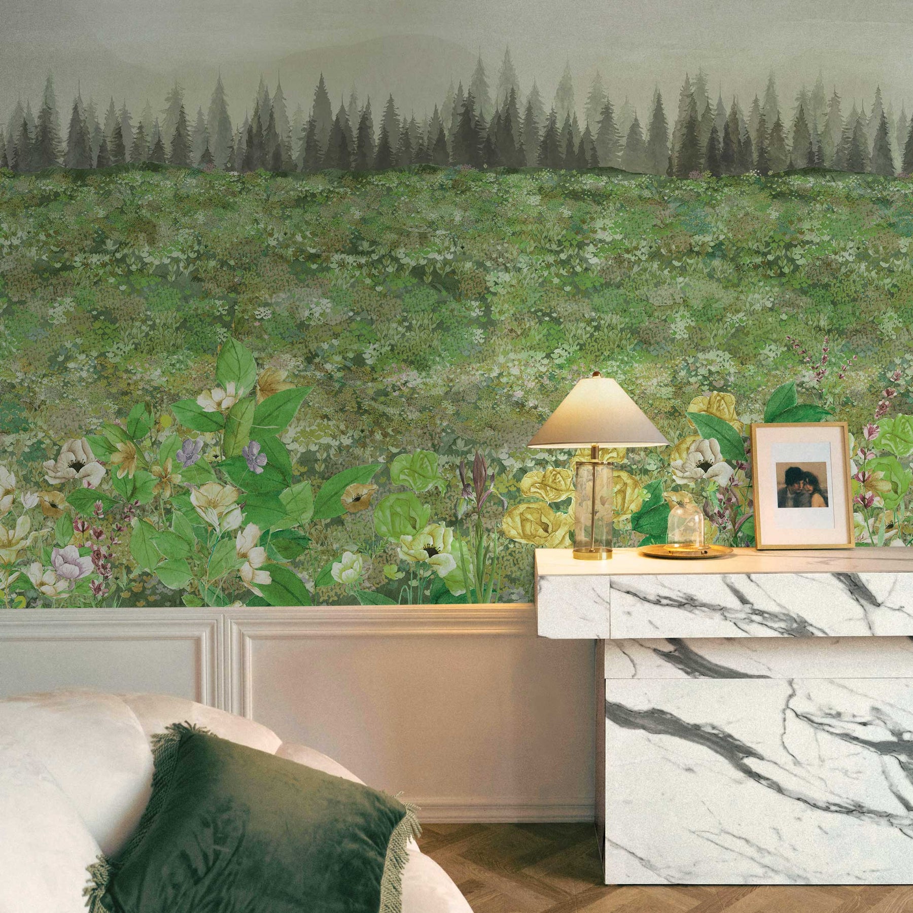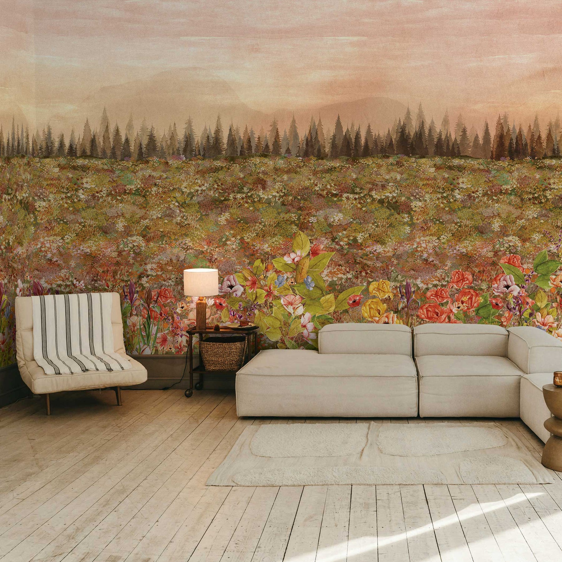 This scenic wall mural captures the serene beauty of a wildflower meadow stretching toward distant mountains and framed by tall evergreen trees. Soft painterly strokes and watercolor tones create a quiet escape that feels both grounded and dreamlike. Applied as a peel and stick wall mural, Wildflower Horizon envelops the room in vivid color and the natural rhythm of an artistic landscape.
