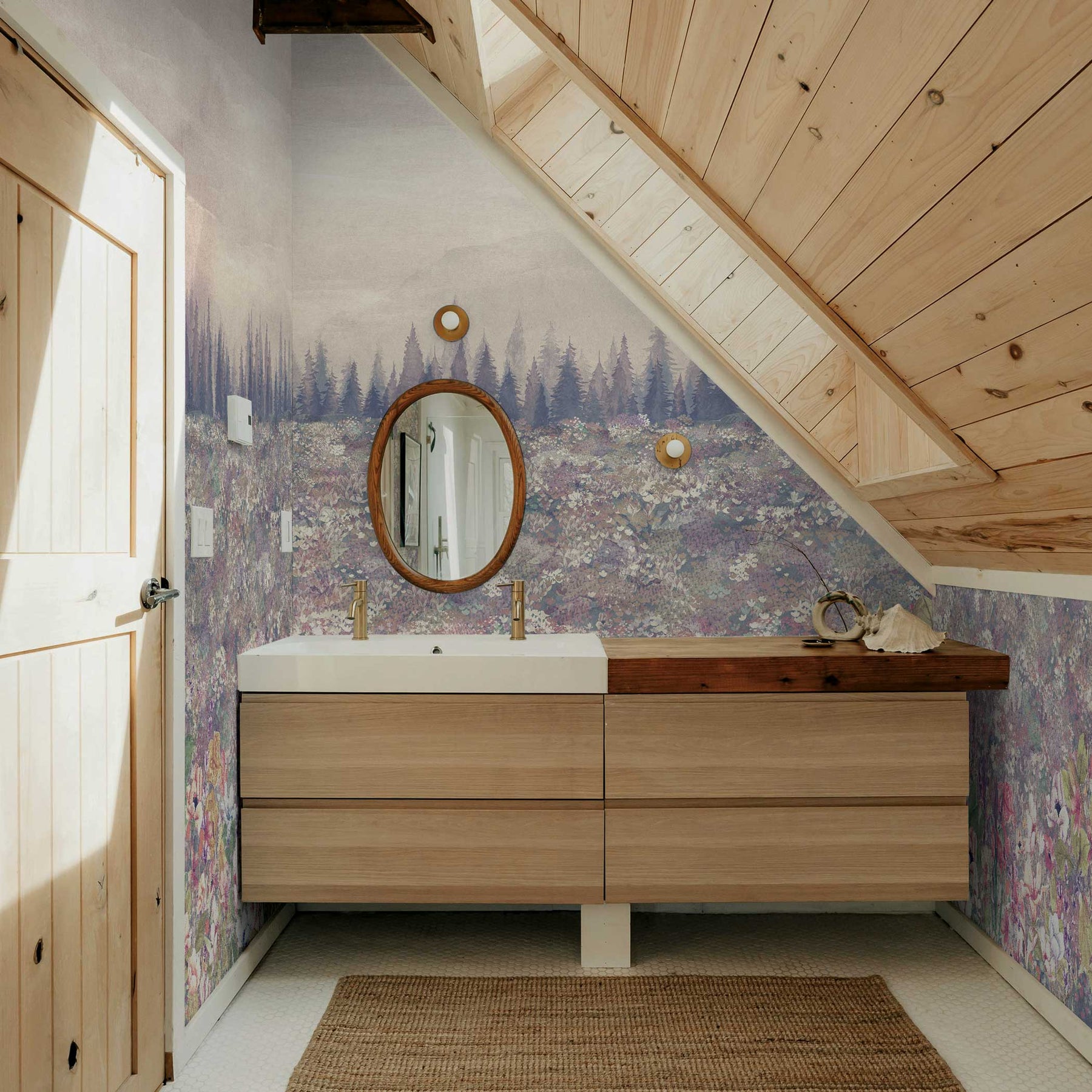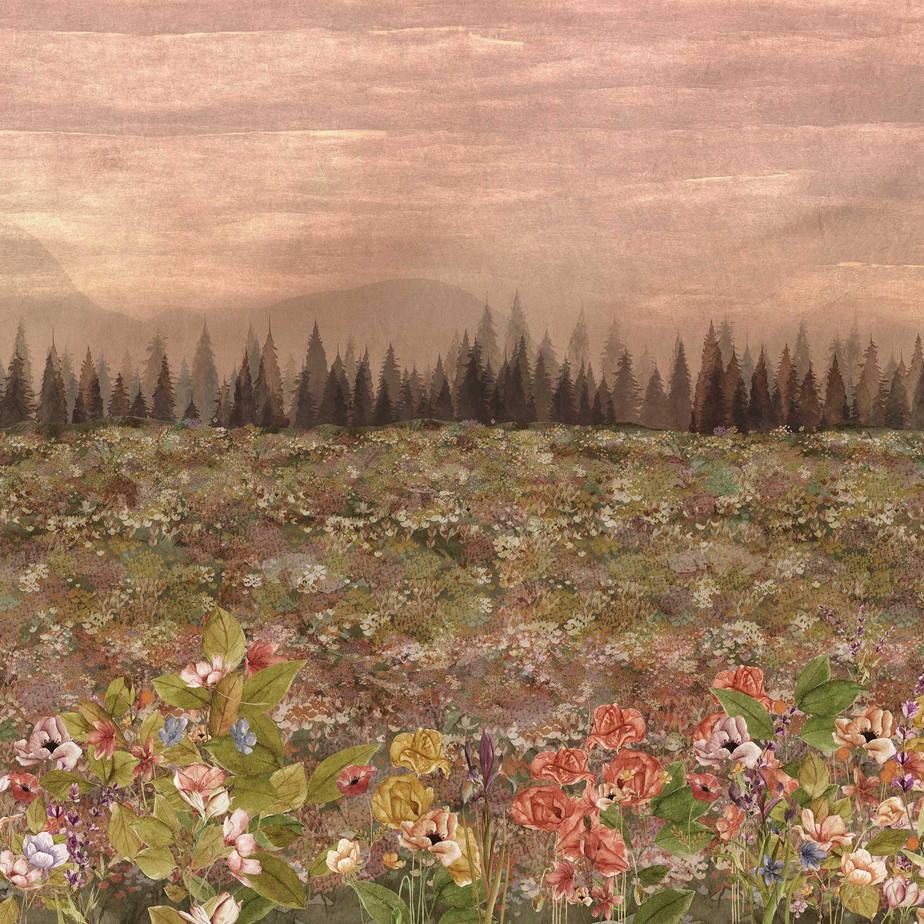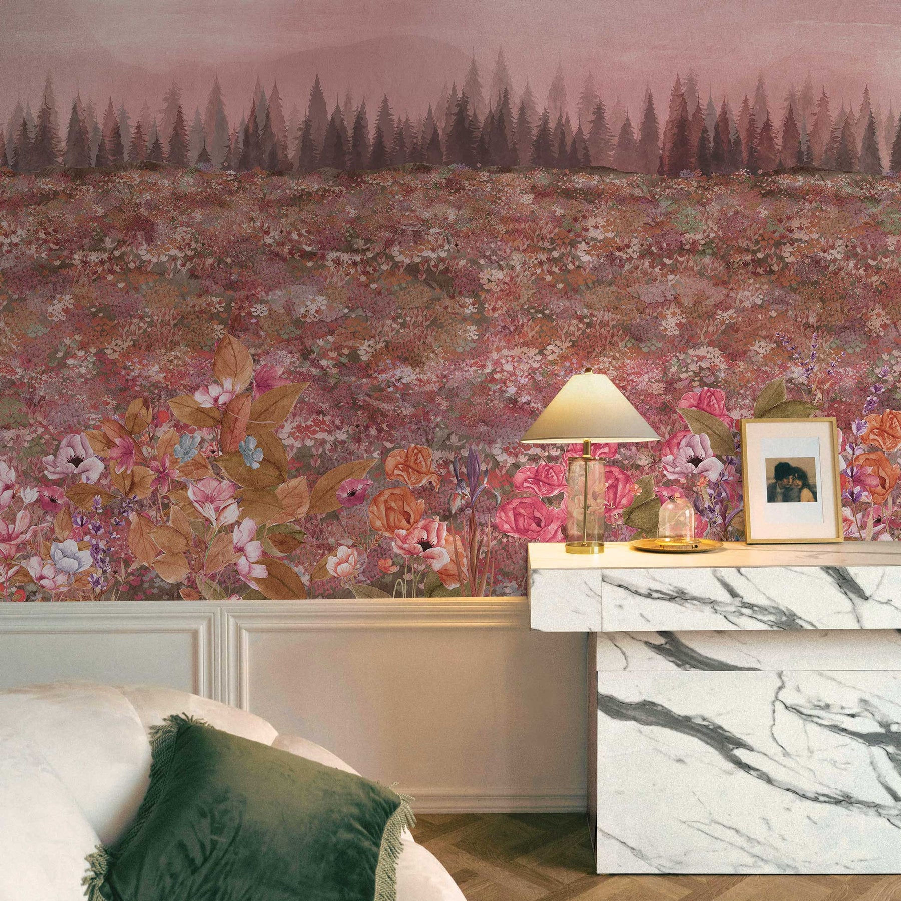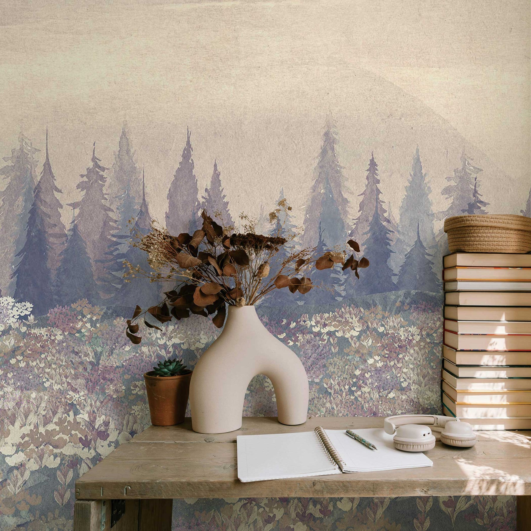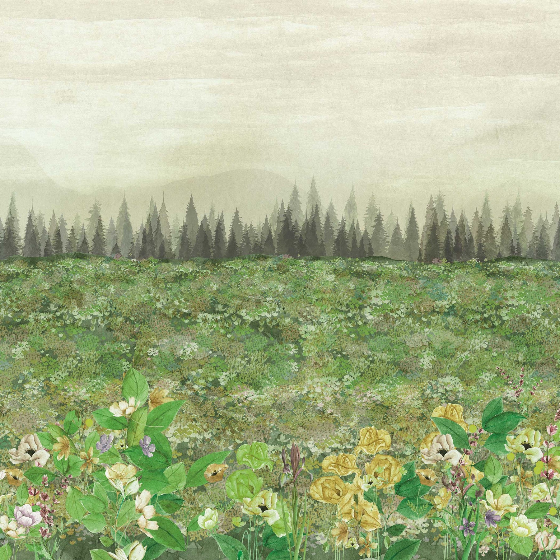 This scenic wall mural captures the serene beauty of a wildflower meadow stretching toward distant mountains and framed by tall evergreen trees. Soft painterly strokes and watercolor tones create a quiet escape that feels both grounded and dreamlike. Applied as a peel and stick wall mural, Wildflower Horizon envelops the room in vivid color and the natural rhythm of an artistic landscape.