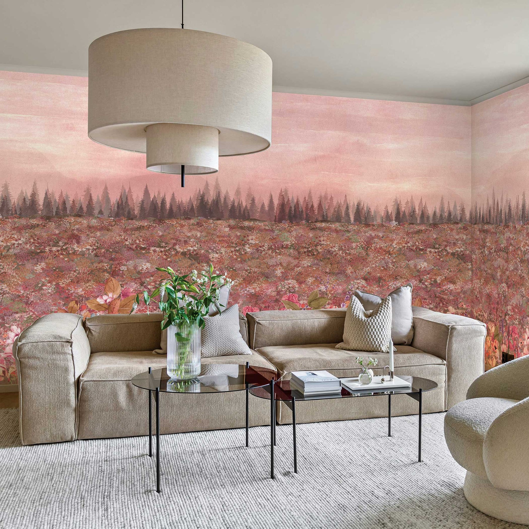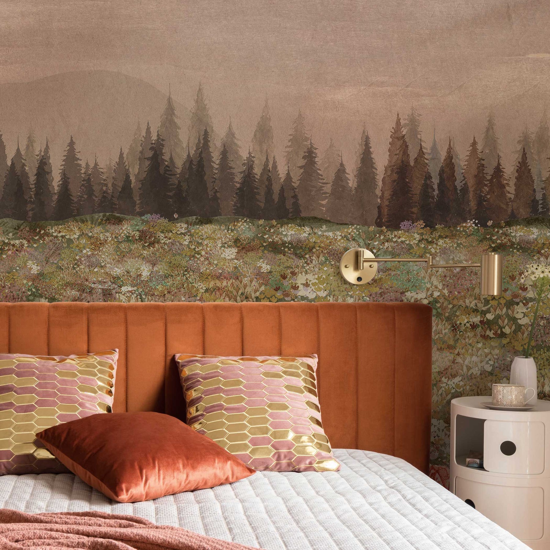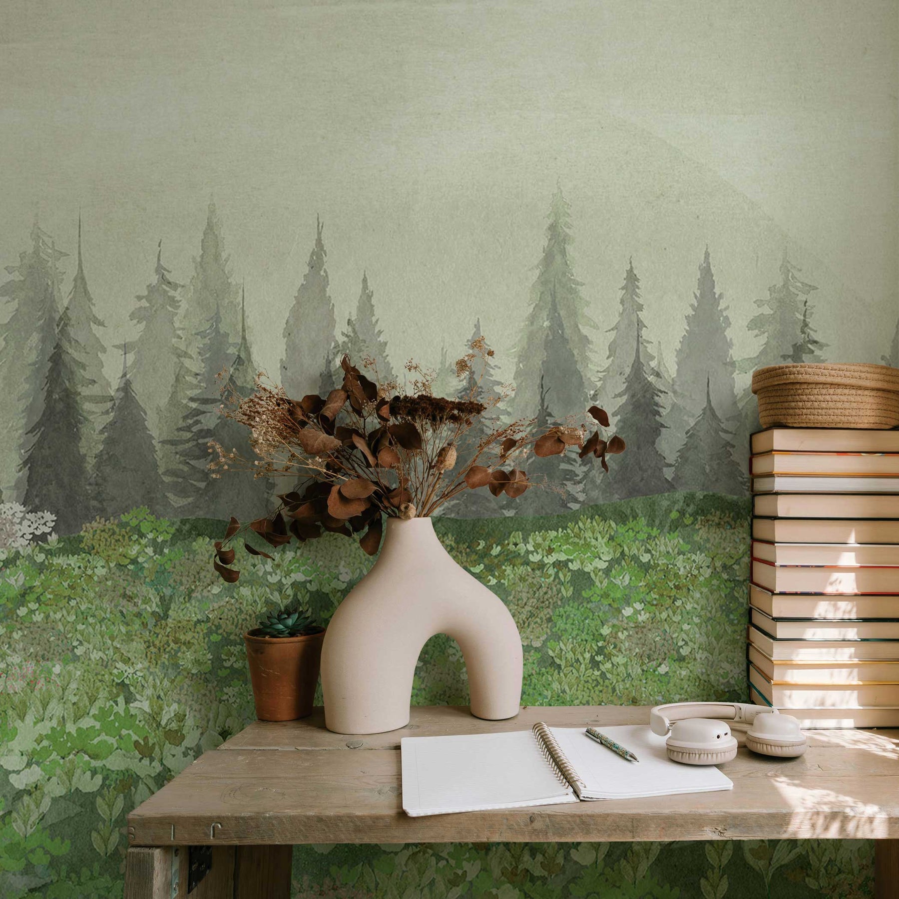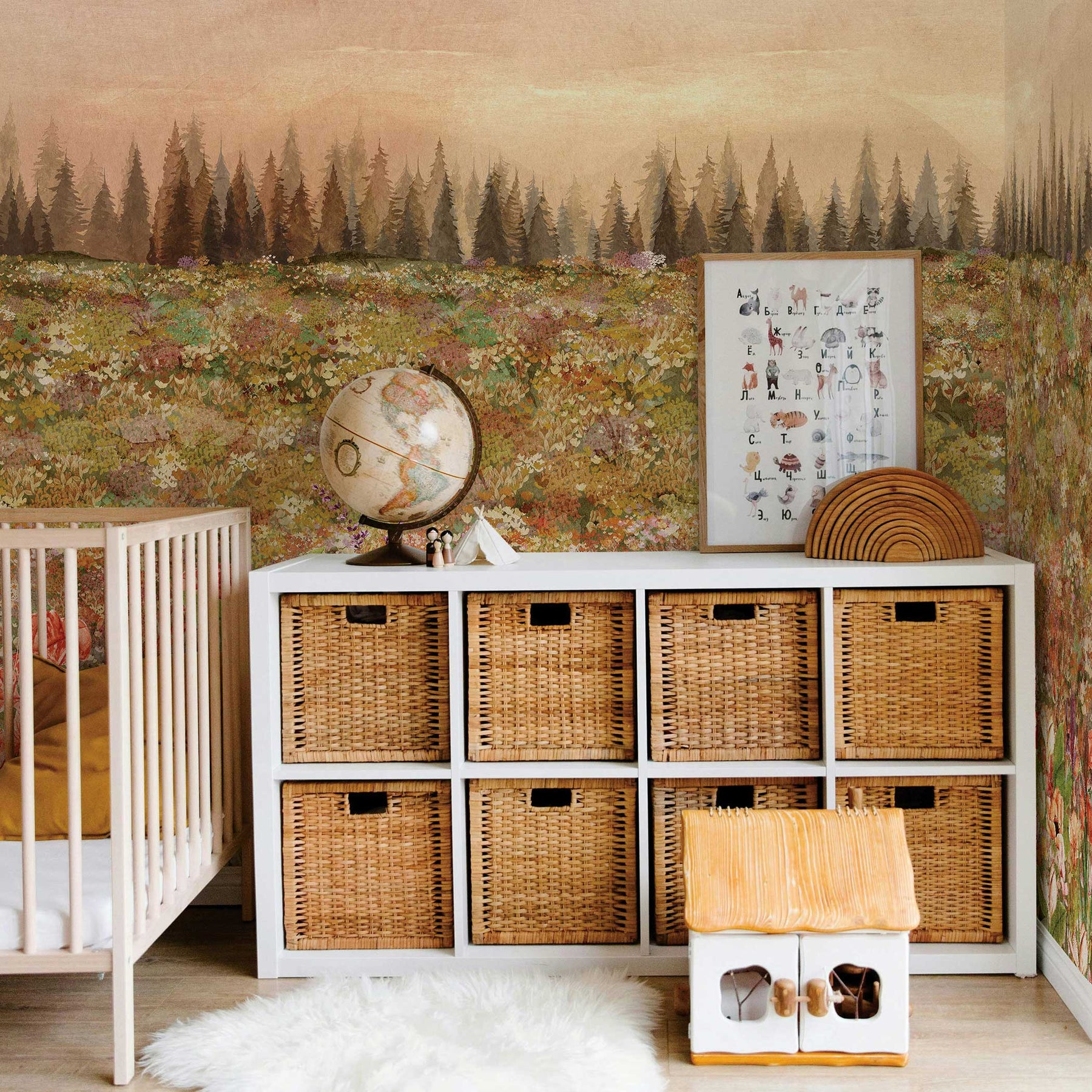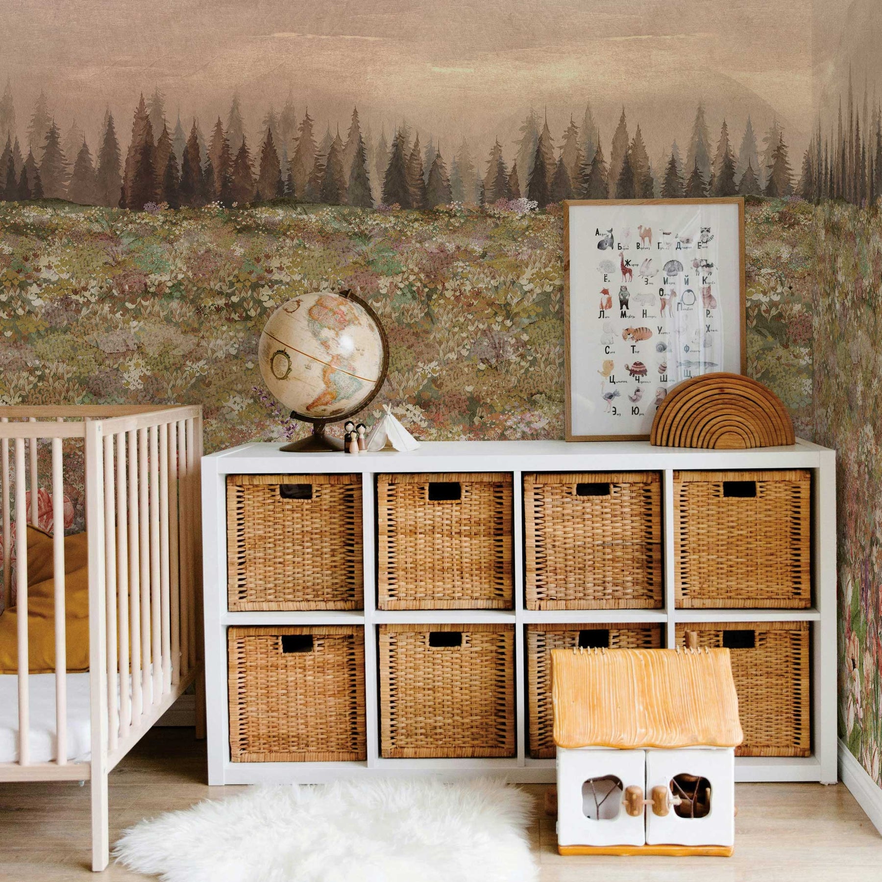 This scenic wall mural captures the serene beauty of a wildflower meadow stretching toward distant mountains and framed by tall evergreen trees. Soft painterly strokes and watercolor tones create a quiet escape that feels both grounded and dreamlike. Applied as a peel and stick wall mural, Wildflower Horizon envelops the room in vivid color and the natural rhythm of an artistic landscape.