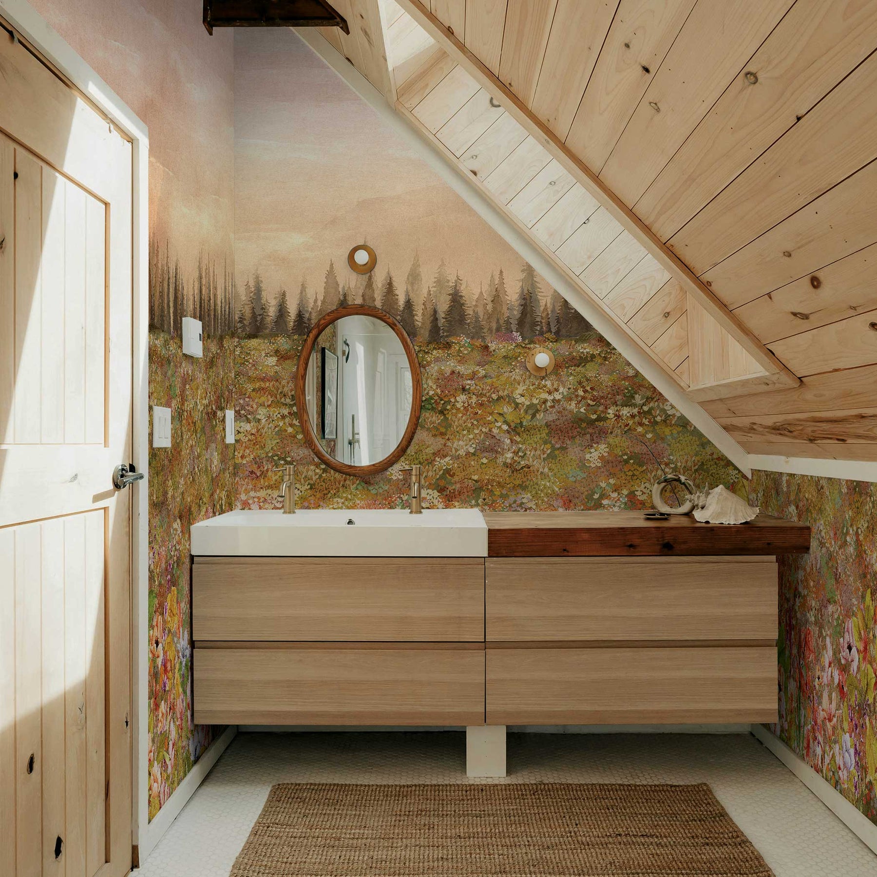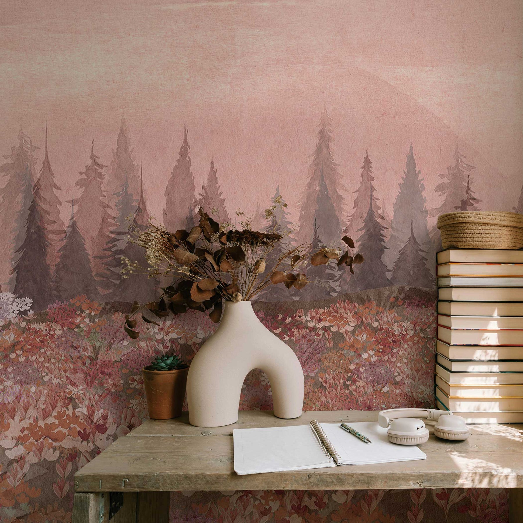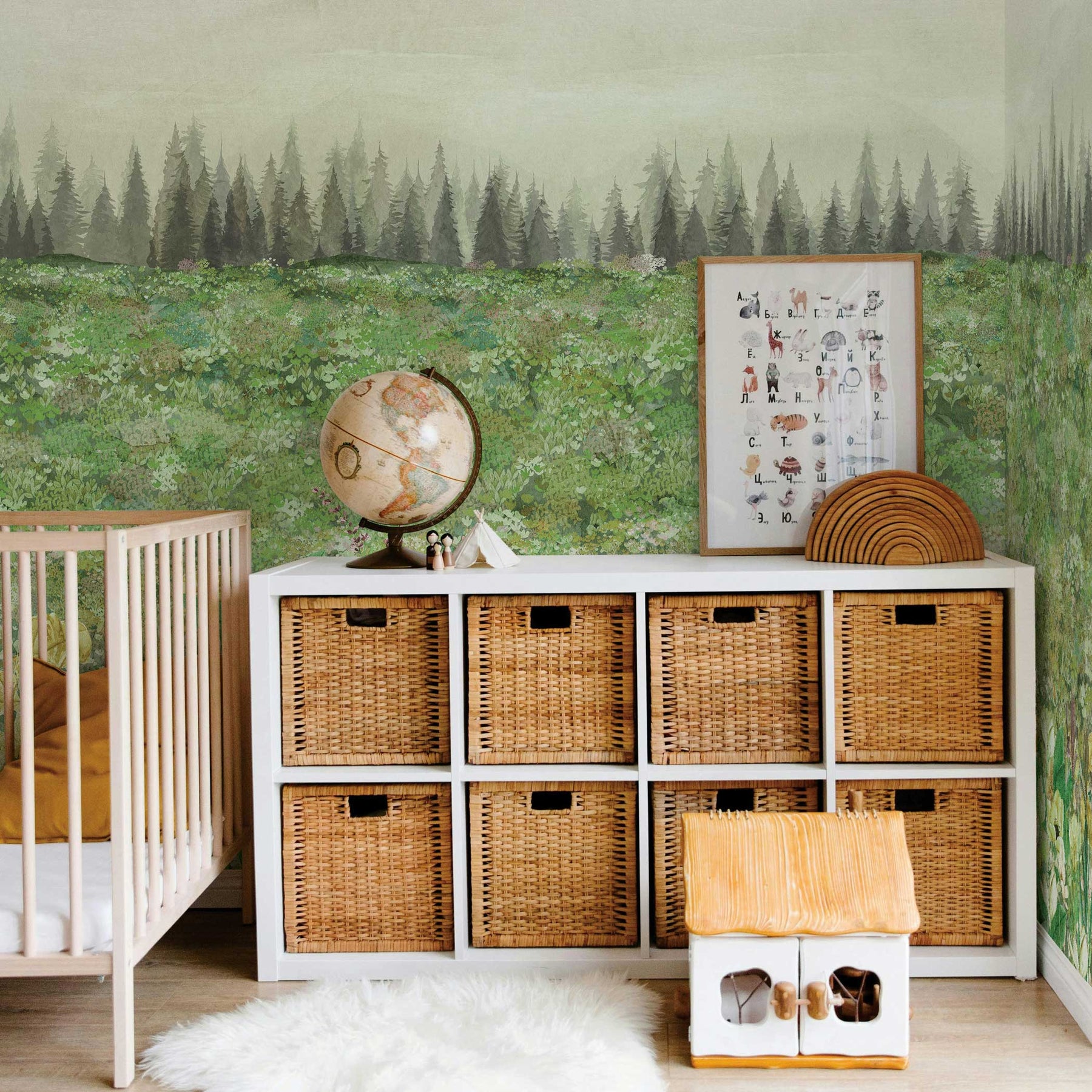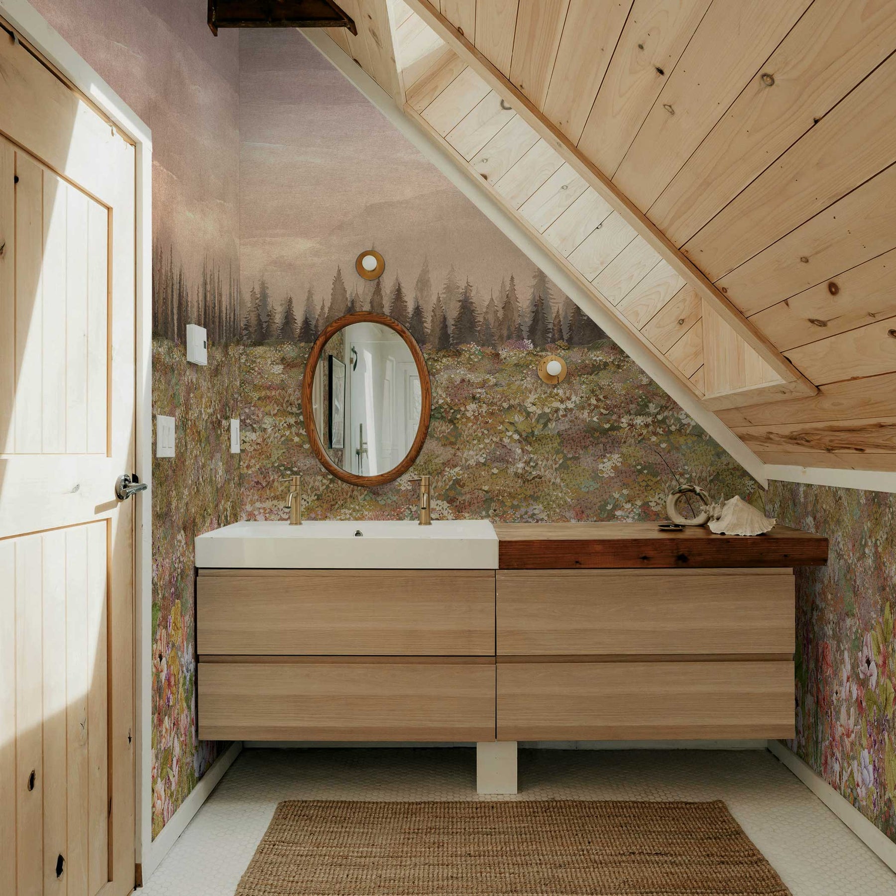 This scenic wall mural captures the serene beauty of a wildflower meadow stretching toward distant mountains and framed by tall evergreen trees. Soft painterly strokes and watercolor tones create a quiet escape that feels both grounded and dreamlike. Applied as a peel and stick wall mural, Wildflower Horizon envelops the room in vivid color and the natural rhythm of an artistic landscape.