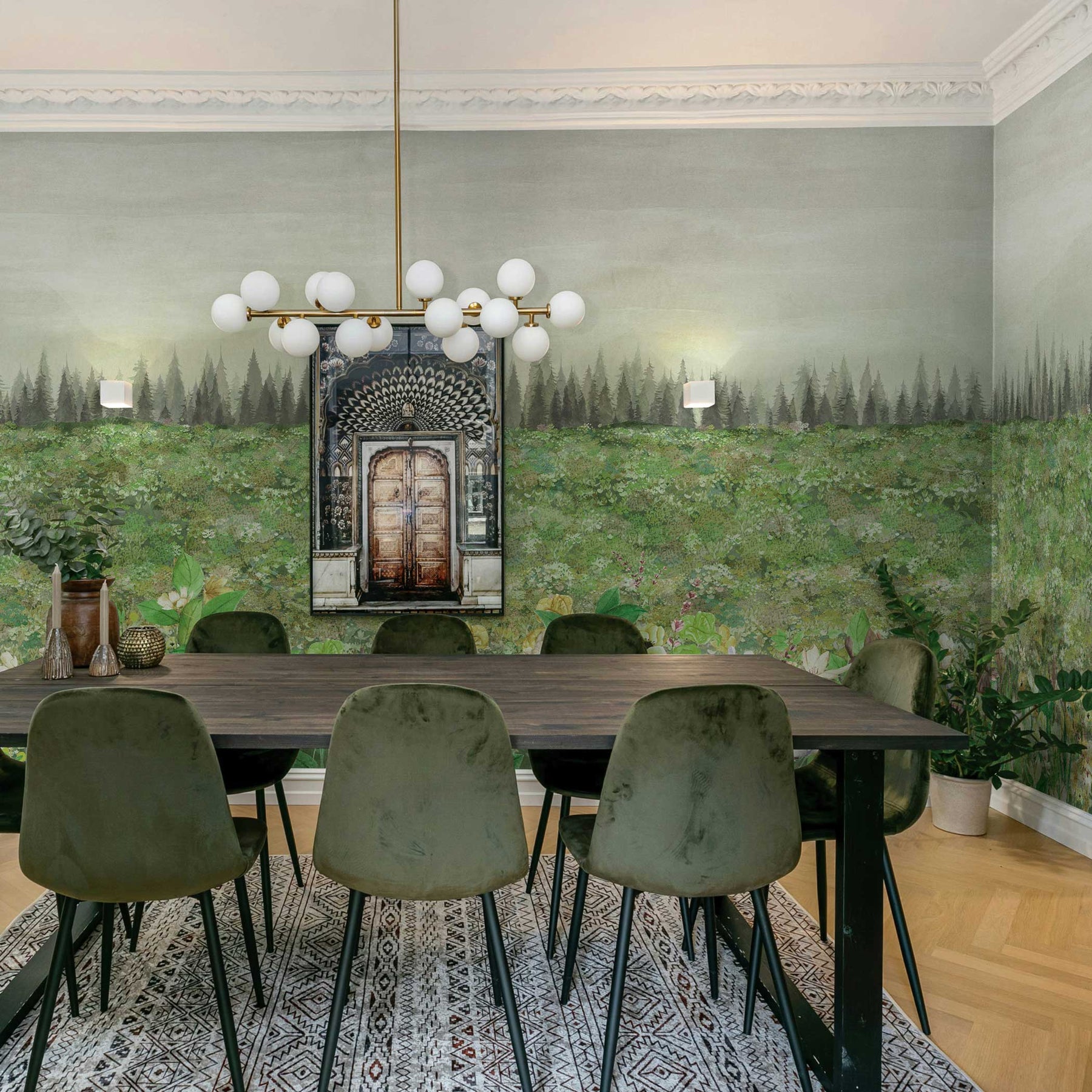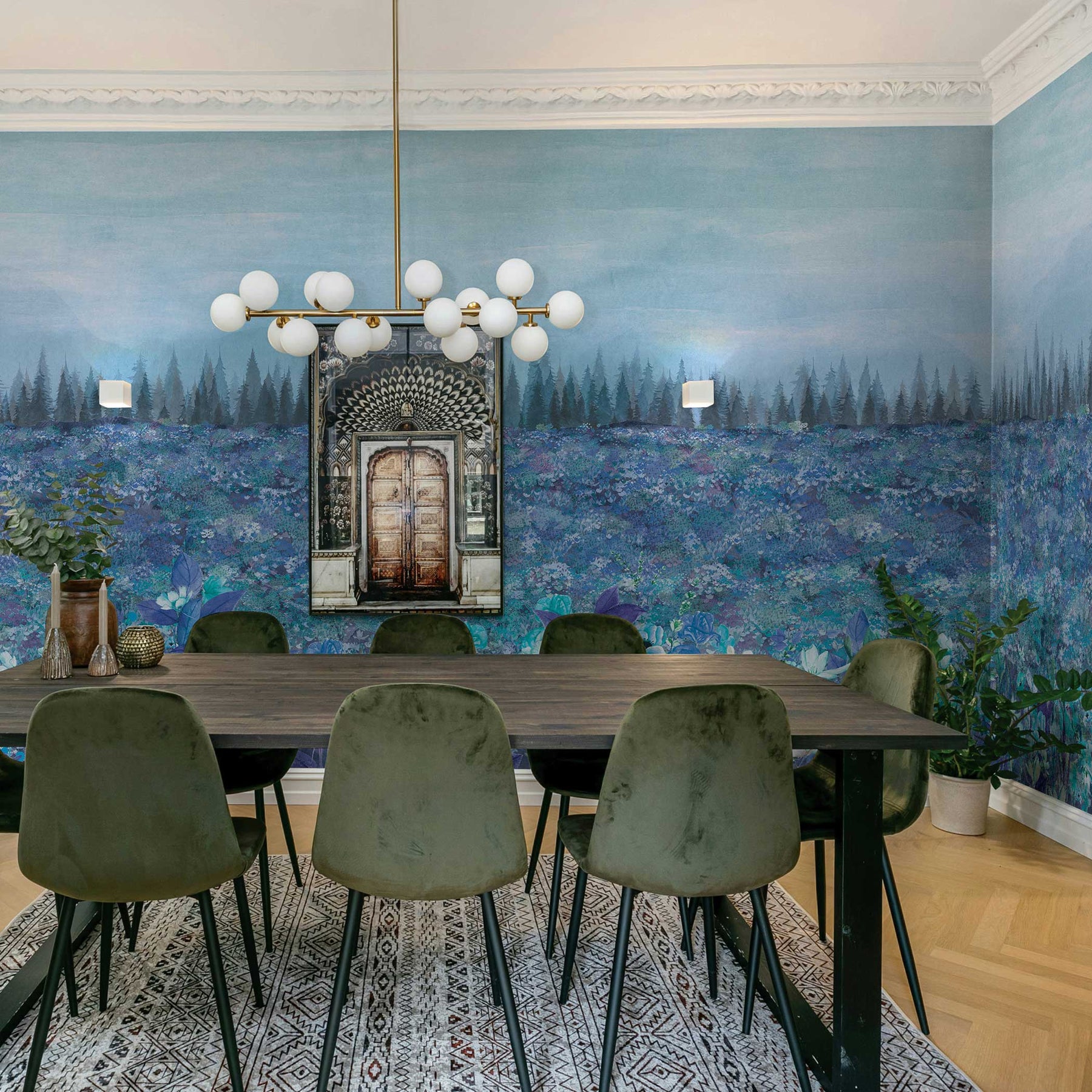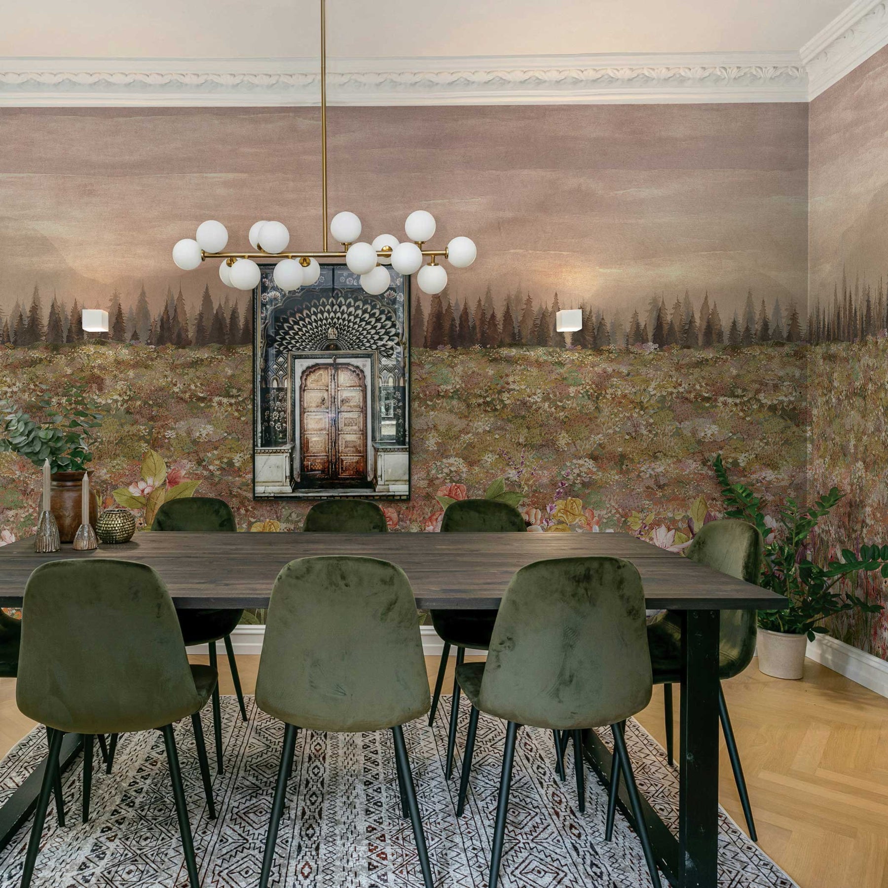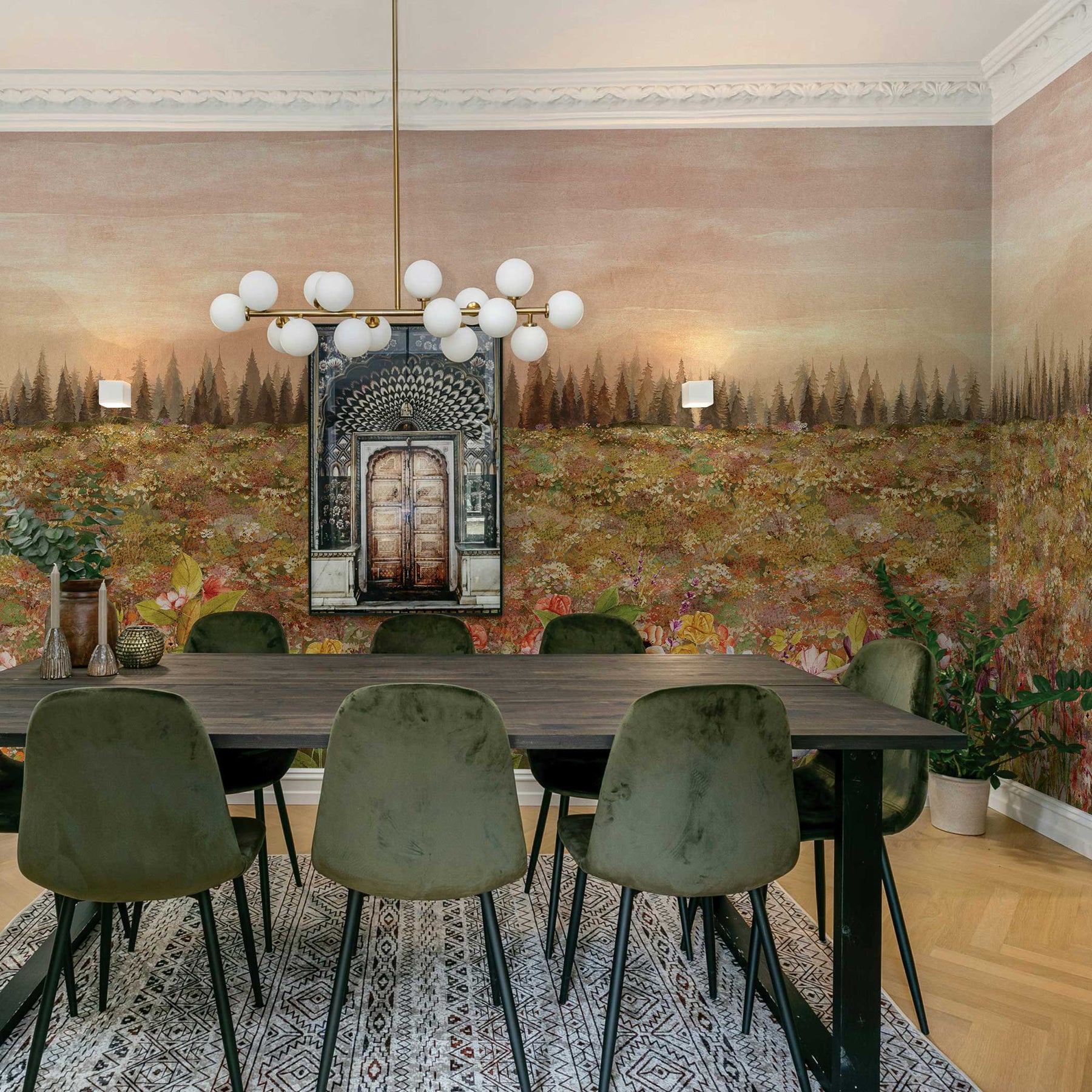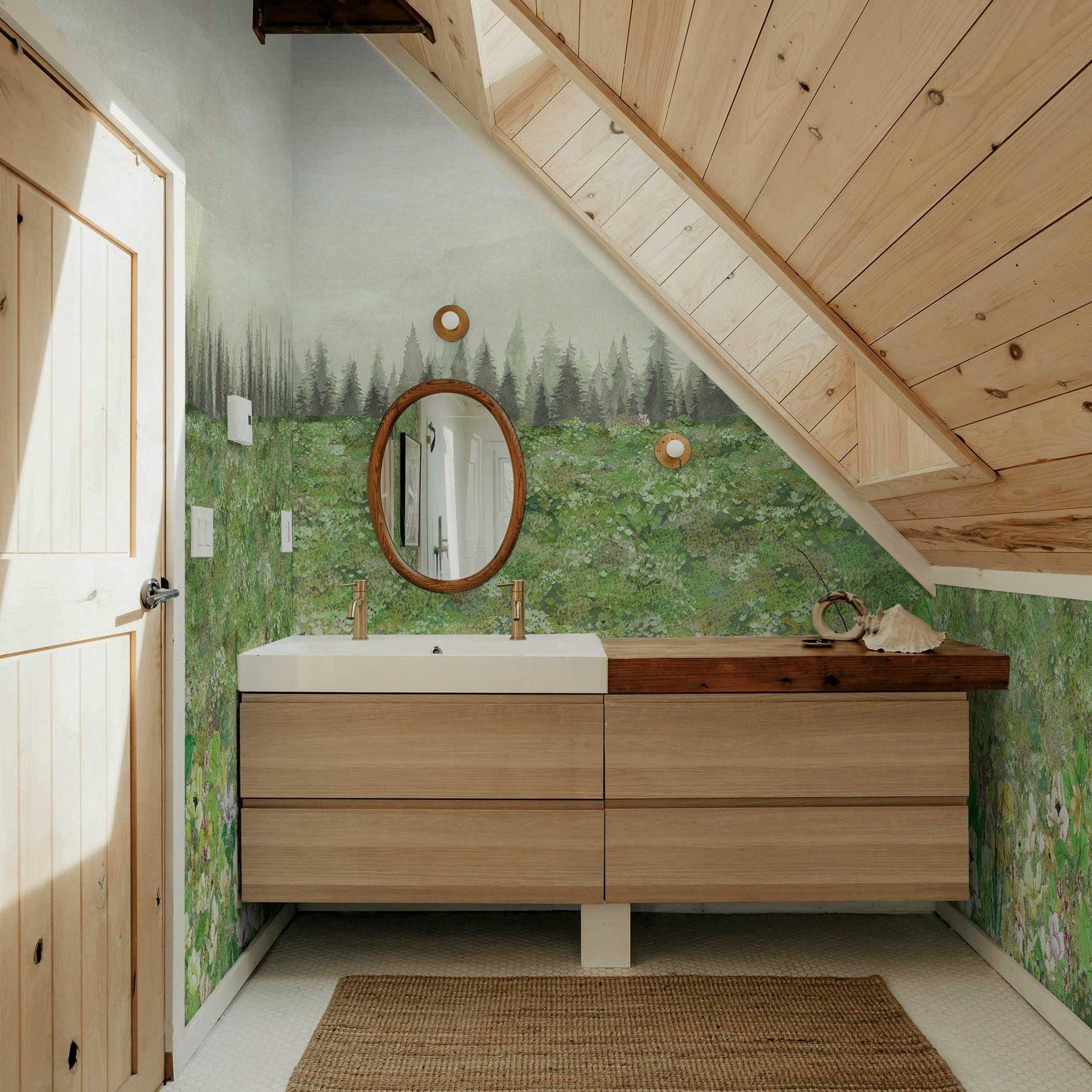 This scenic wall mural captures the serene beauty of a wildflower meadow stretching toward distant mountains and framed by tall evergreen trees. Soft painterly strokes and watercolor tones create a quiet escape that feels both grounded and dreamlike. Applied as a peel and stick wall mural, Wildflower Horizon envelops the room in vivid color and the natural rhythm of an artistic landscape.