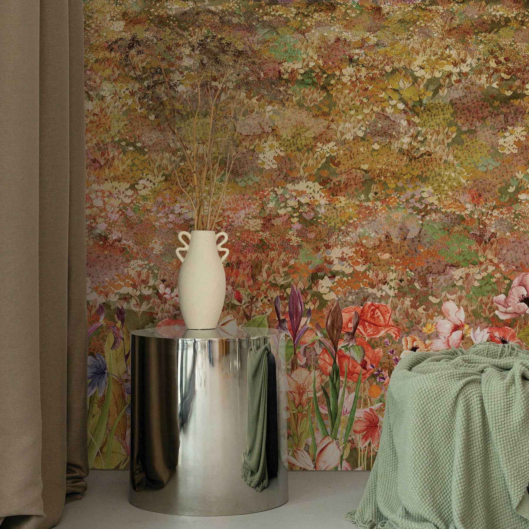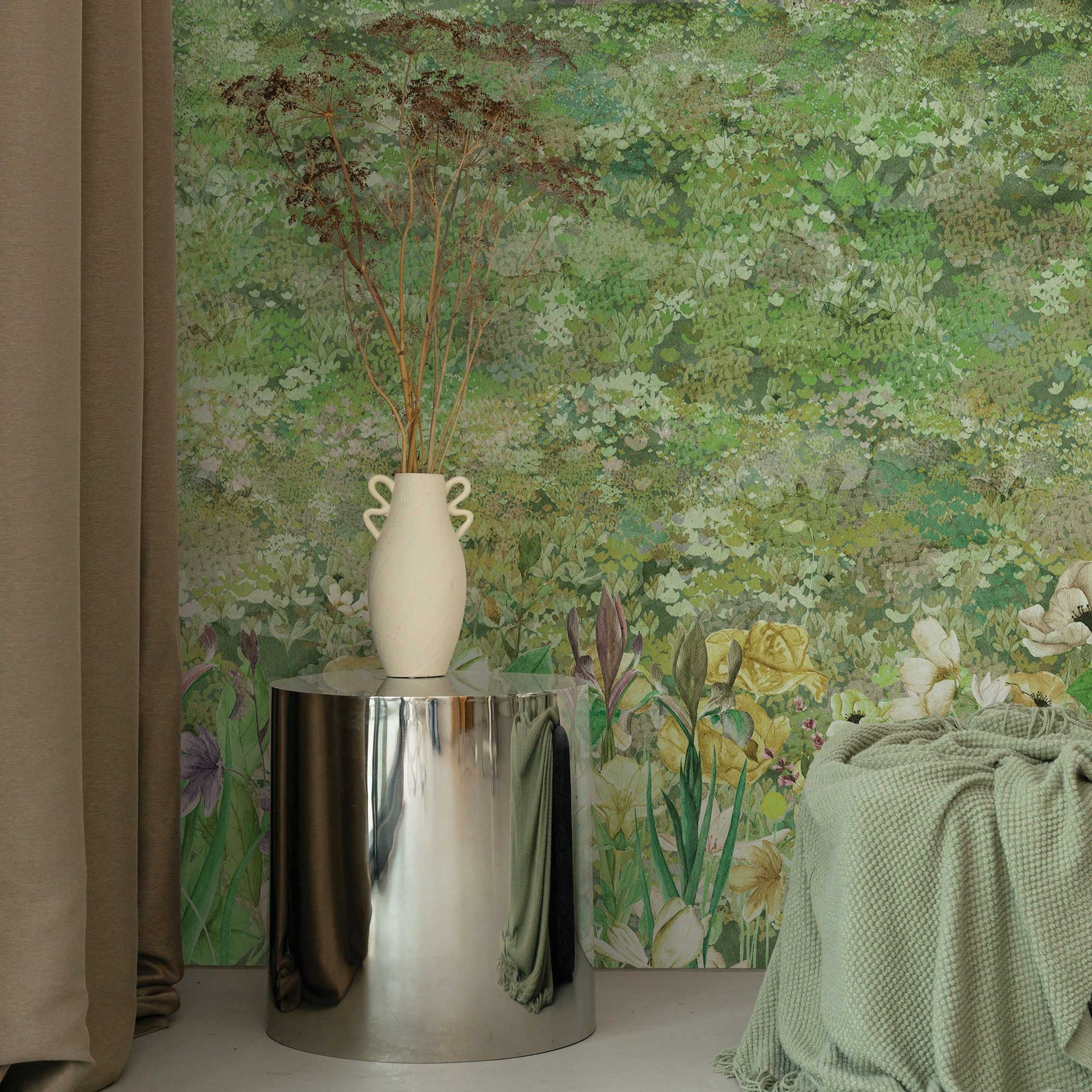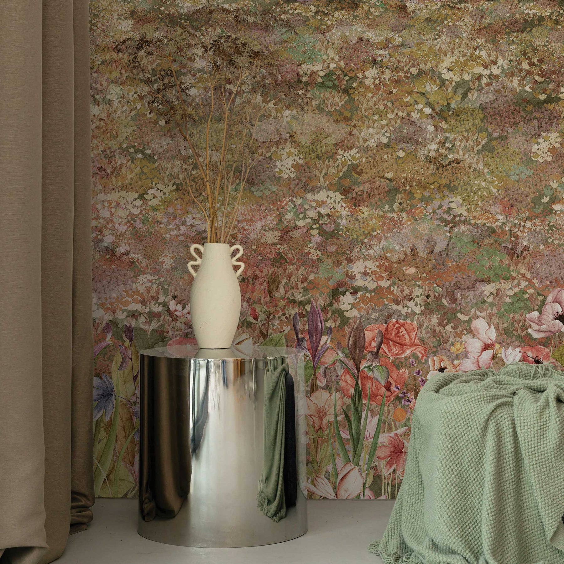 Available in six distinct color palettes, including Sage & Lavender, Primrose Pink, Golden Hour, Iris Blue, Zinnia Green, and Dusted Sunrise. This removable mural design repeats seamlessly, allowing you to wrap an entire room or create a stunning focal wall.