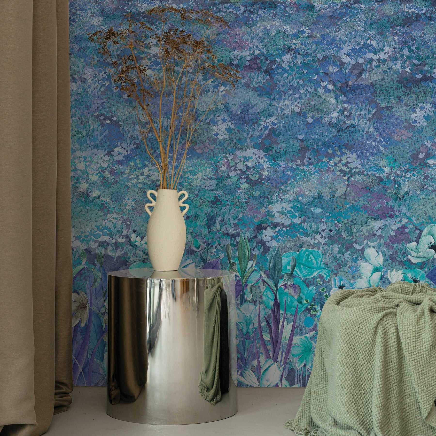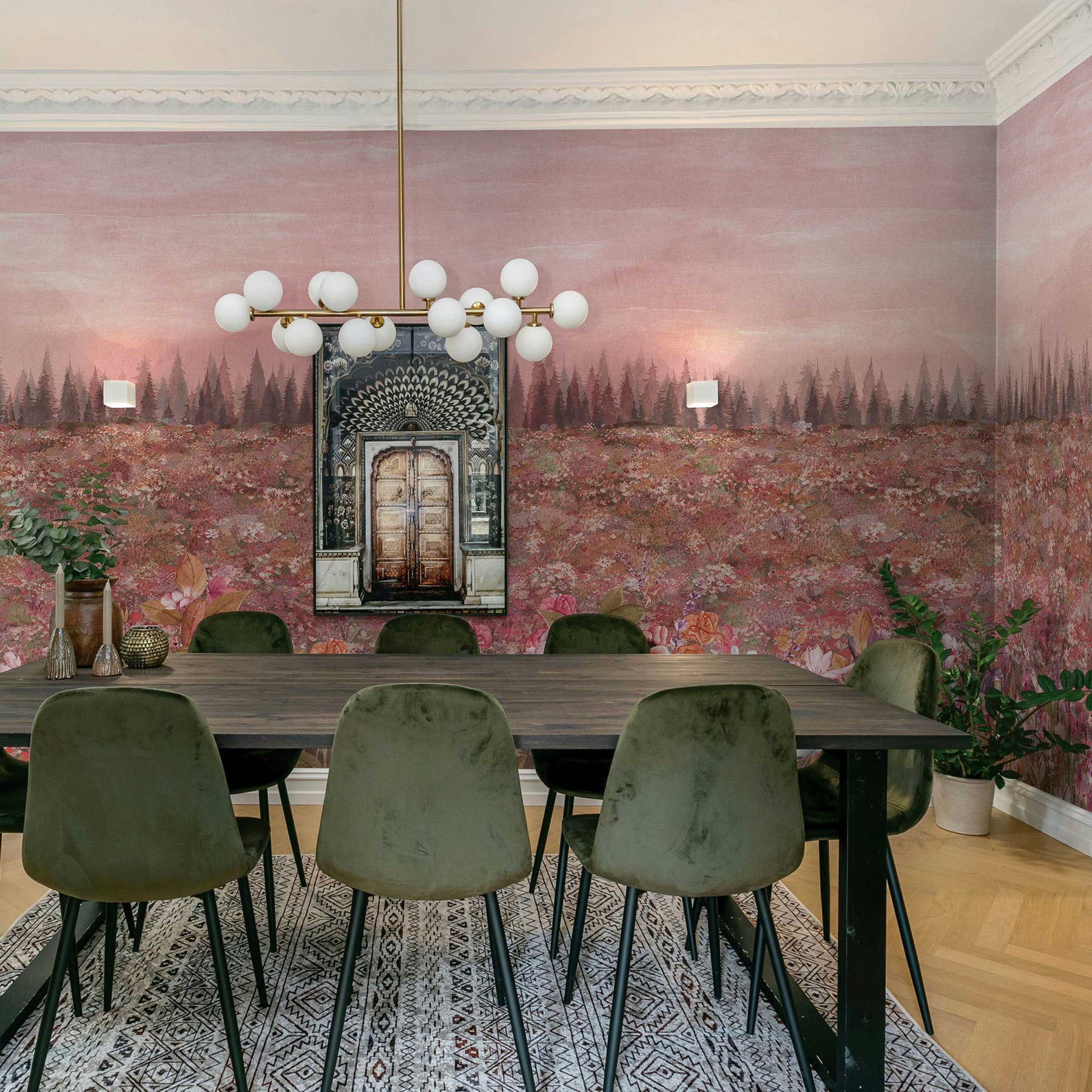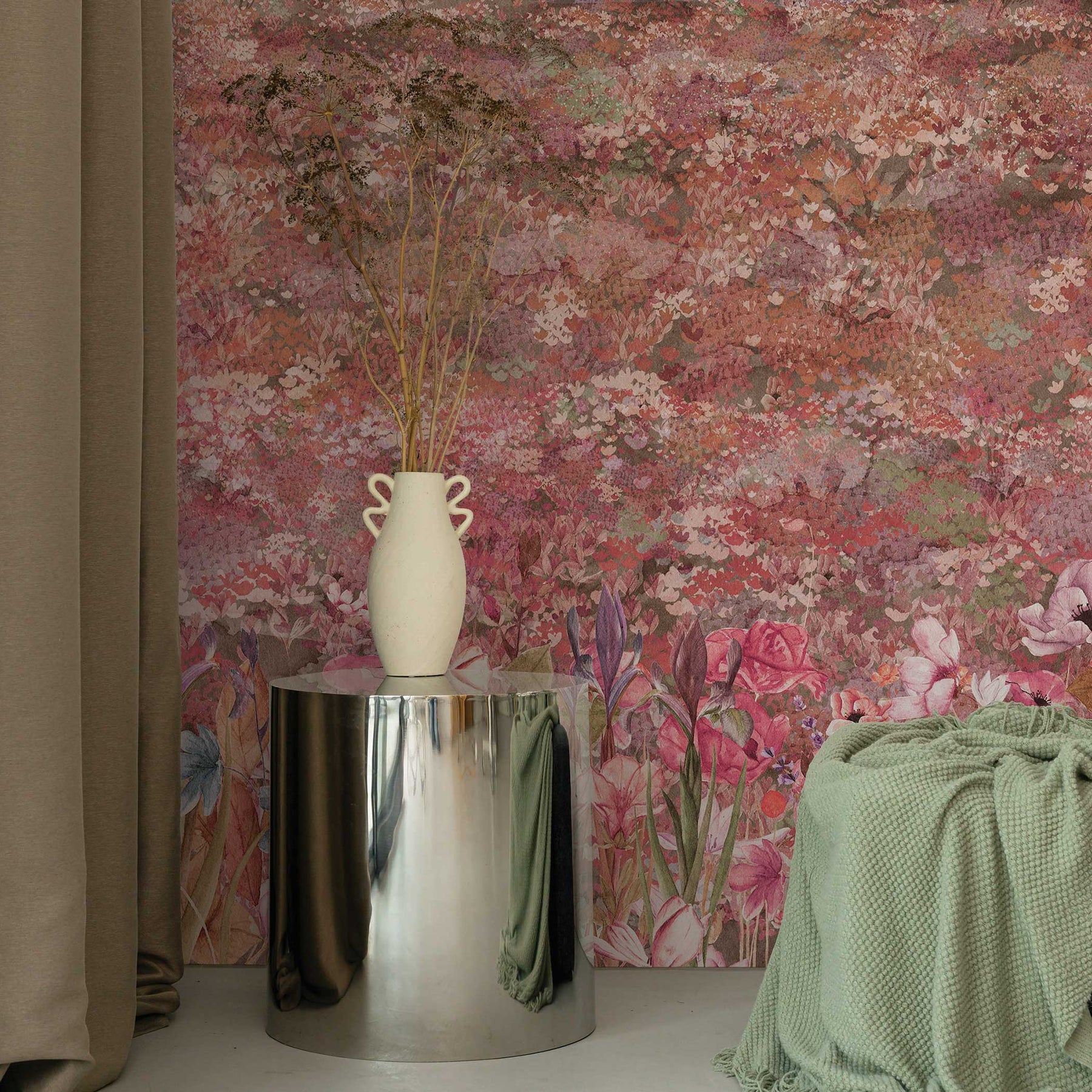 Available in six distinct color palettes, including Sage & Lavender, Primrose Pink, Golden Hour, Iris Blue, Zinnia Green, and Dusted Sunrise. This removable mural design repeats seamlessly, allowing you to wrap an entire room or create a stunning focal wall.