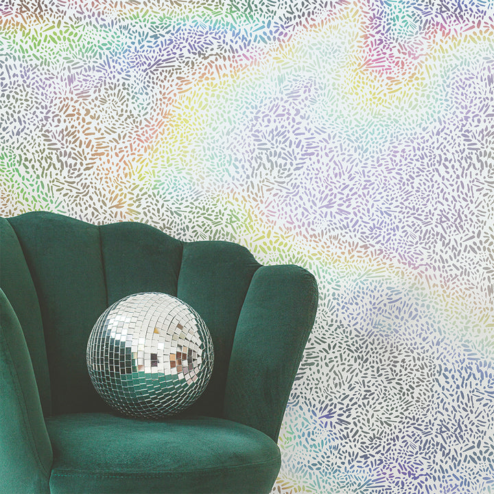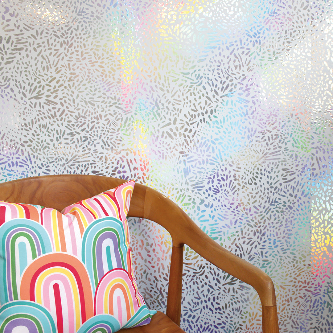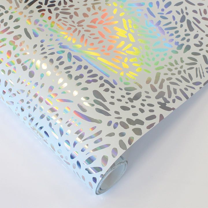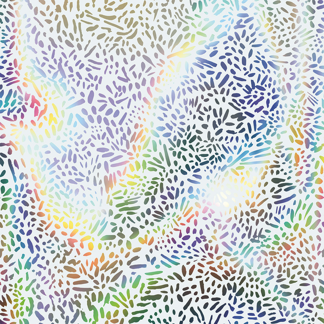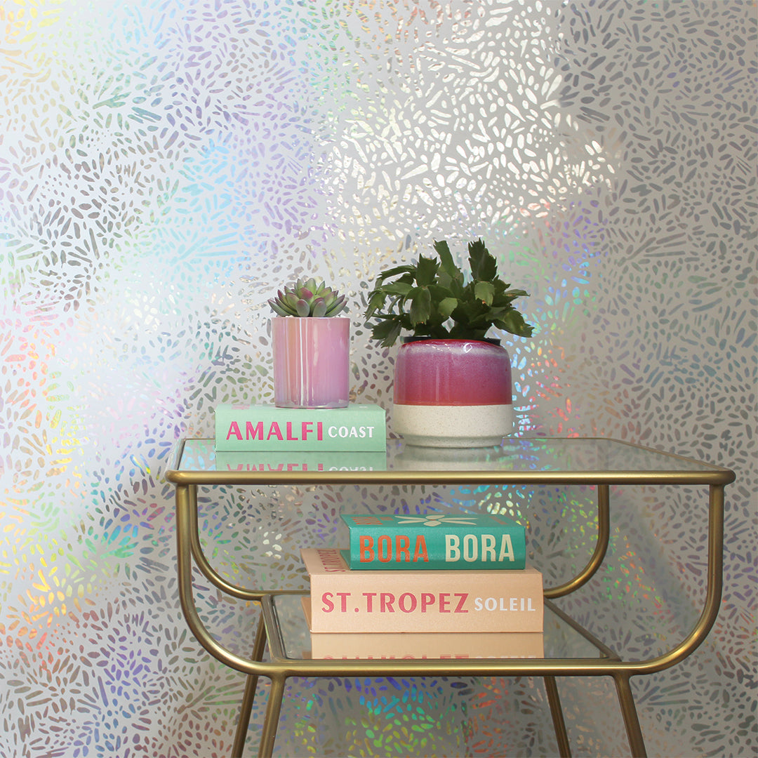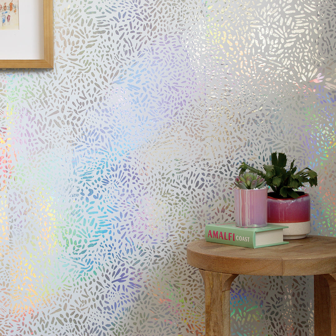 Brighten your space with our white and silver Holographic Brushstroke Garden Peel and Stick Wallpaper. The silver holographic base shines through a layer of white, forming bold brushstokes that shift as the light moves. The effect is dynamic and luminous, adding depth, movement, and a shimmering rainbow of color to your walls.