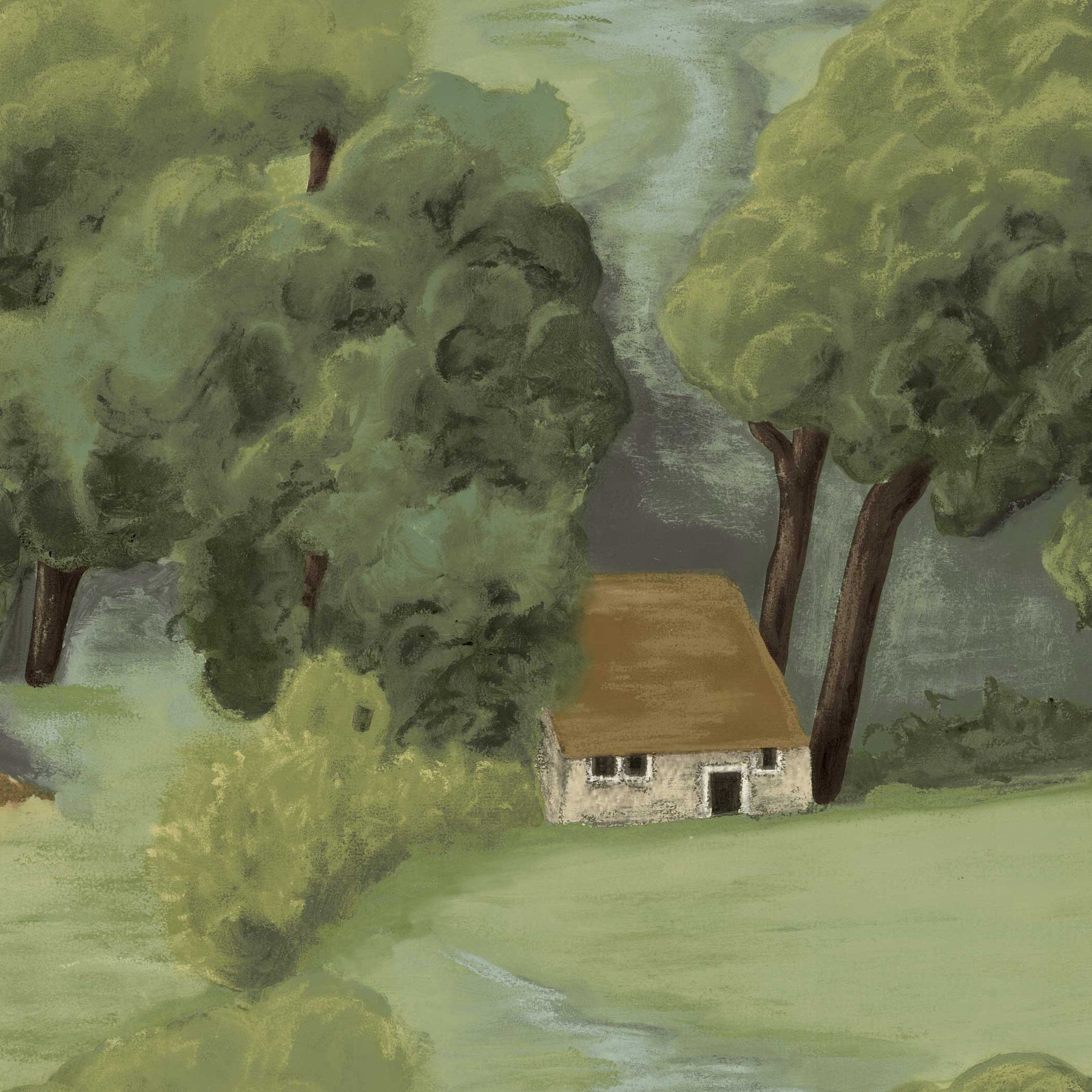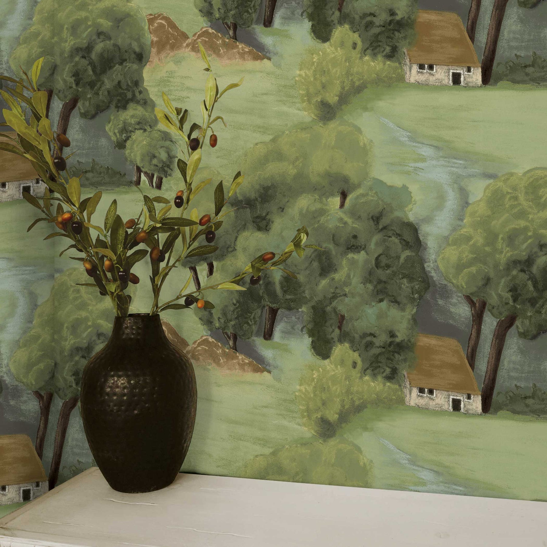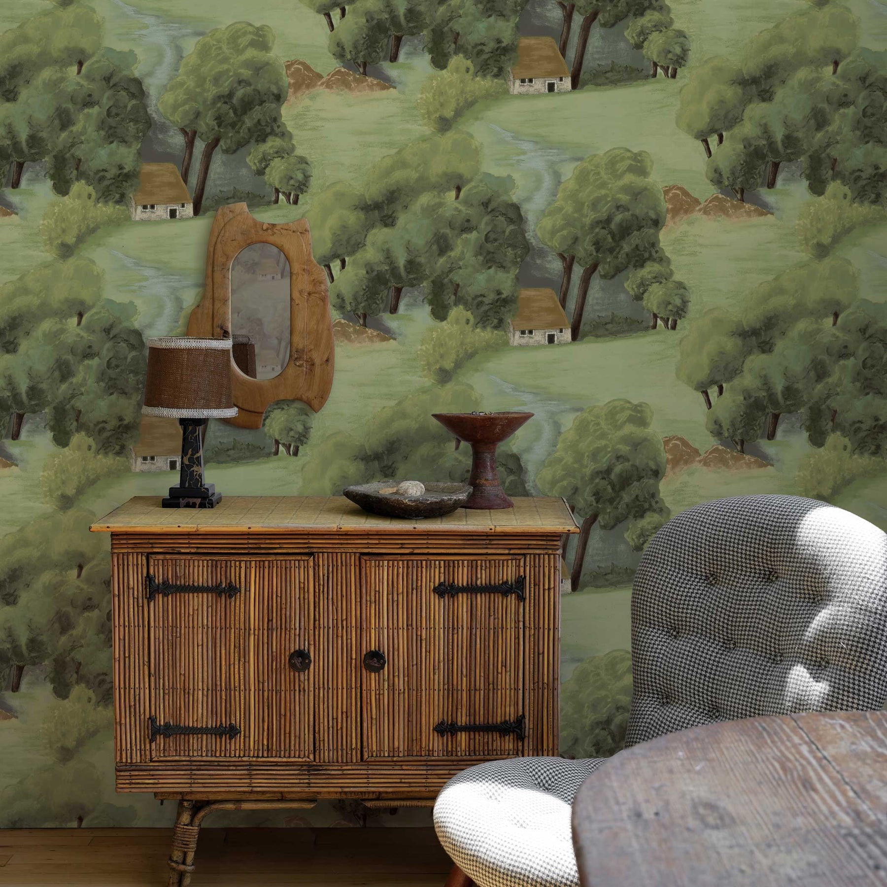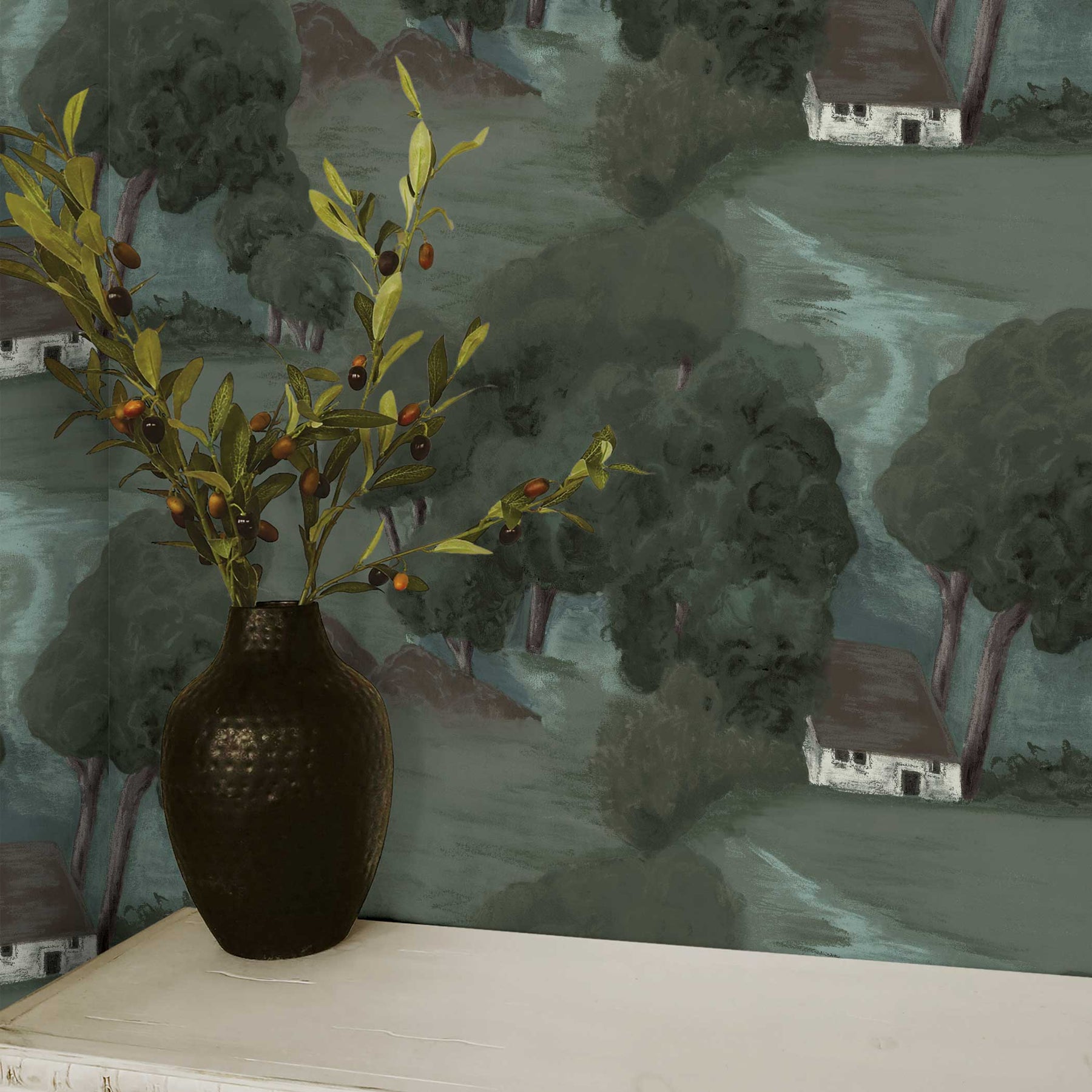 Part of our exclusive Second Nature collection by Jeremiah Brent, Fallow peel and stick wallpaper features a dreamy landscape that layers tones and forms that are designed to evoke a feeling of homegrown nostalgia. Lush greenery enveloping quaint homes in a serene rural setting come together to create a true statement piece that pays homage to meaningful moments in everyday life.
