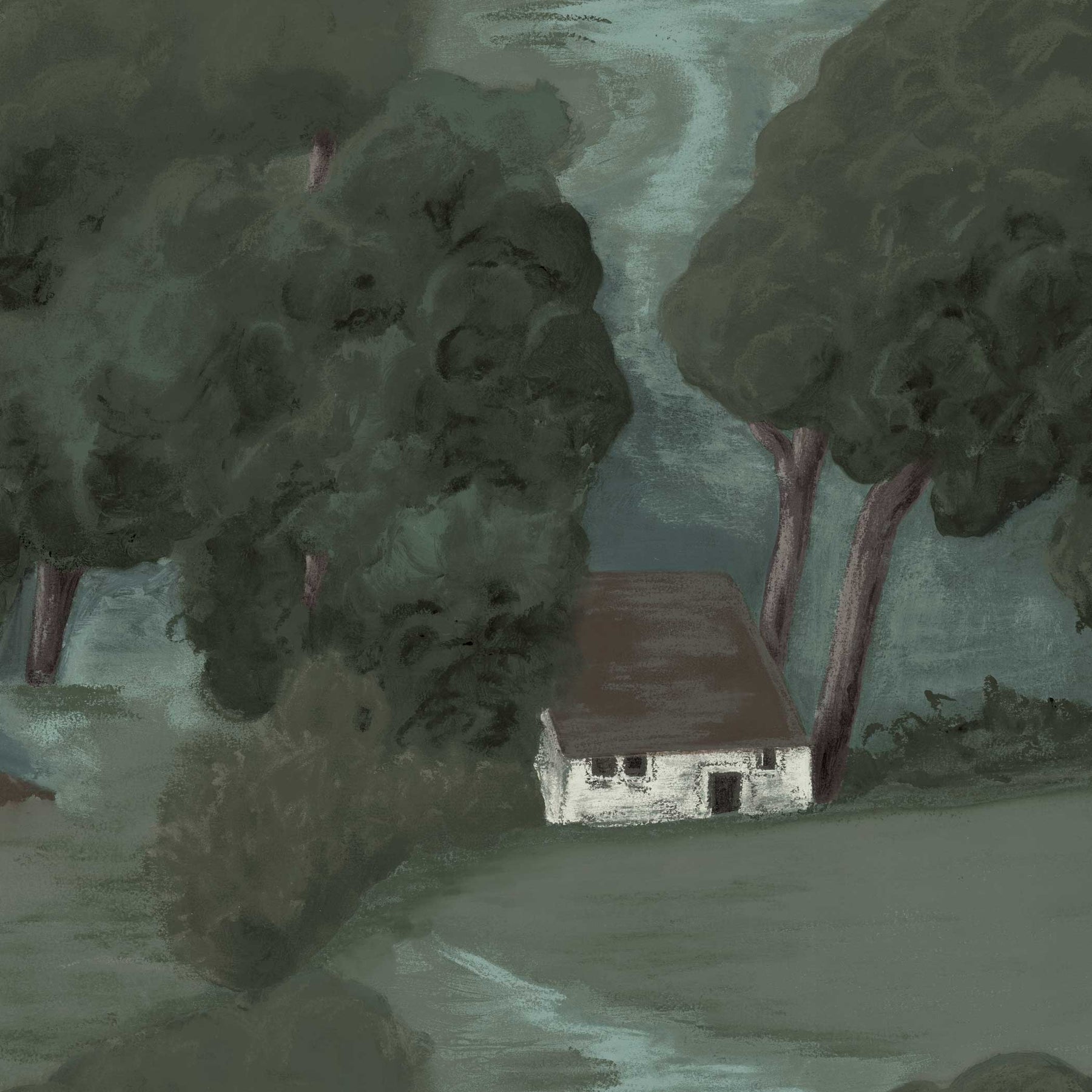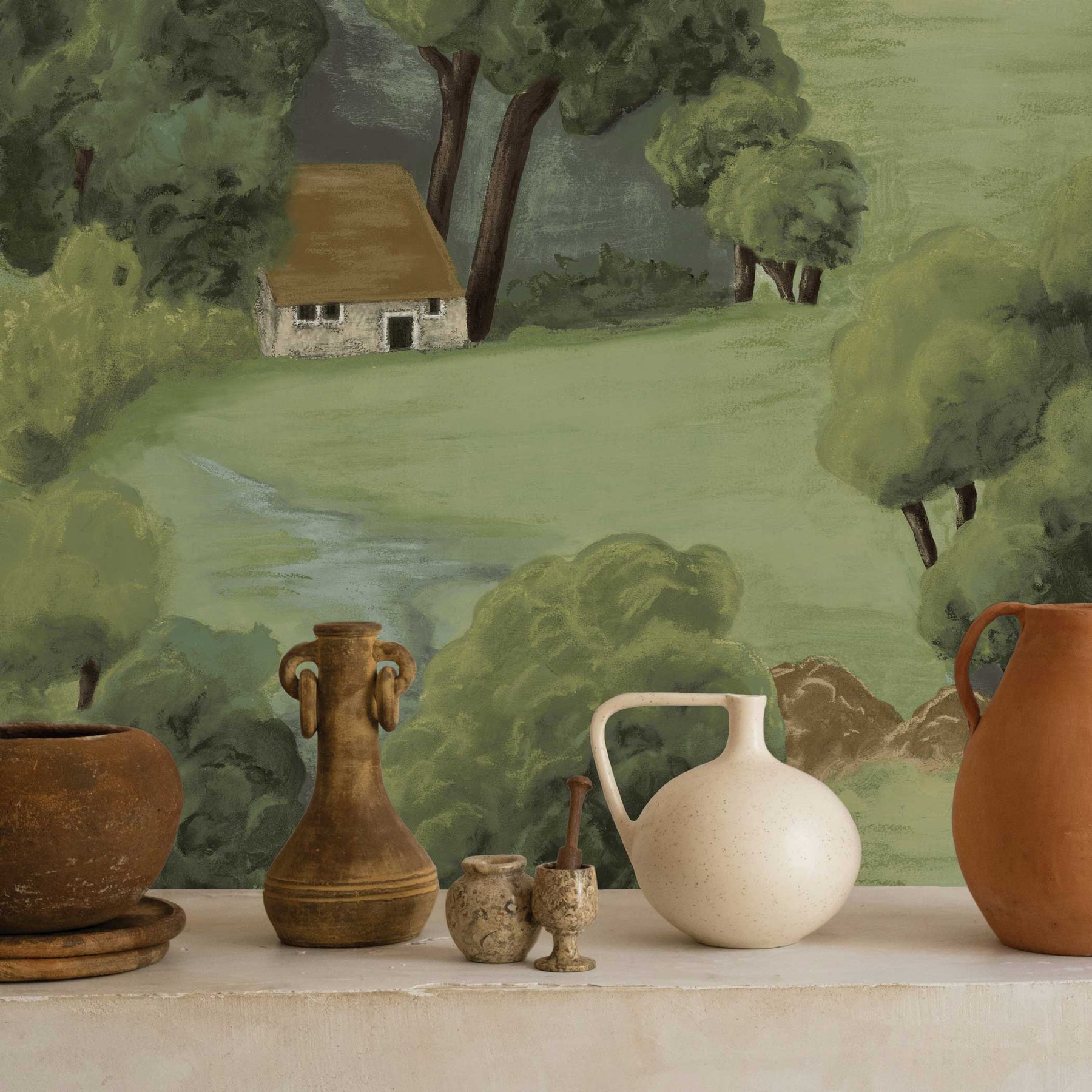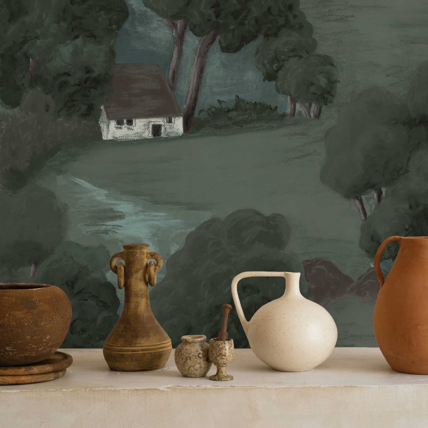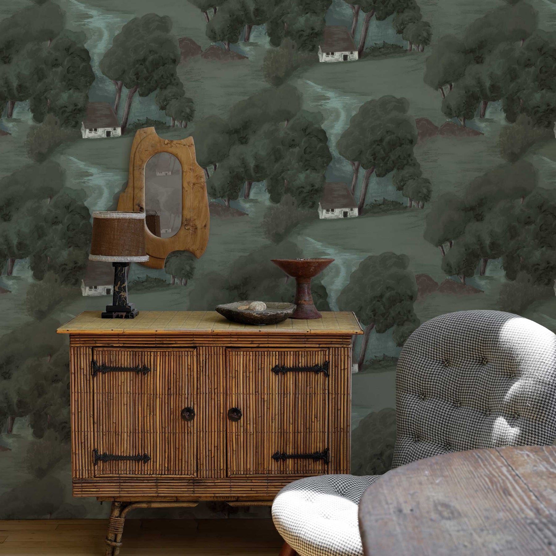 Part of our exclusive Second Nature collection by Jeremiah Brent, Fallow peel and stick wallpaper features a dreamy landscape that layers tones and forms that are designed to evoke a feeling of homegrown nostalgia. Lush greenery enveloping quaint homes in a serene rural setting come together to create a true statement piece that pays homage to meaningful moments in everyday life.