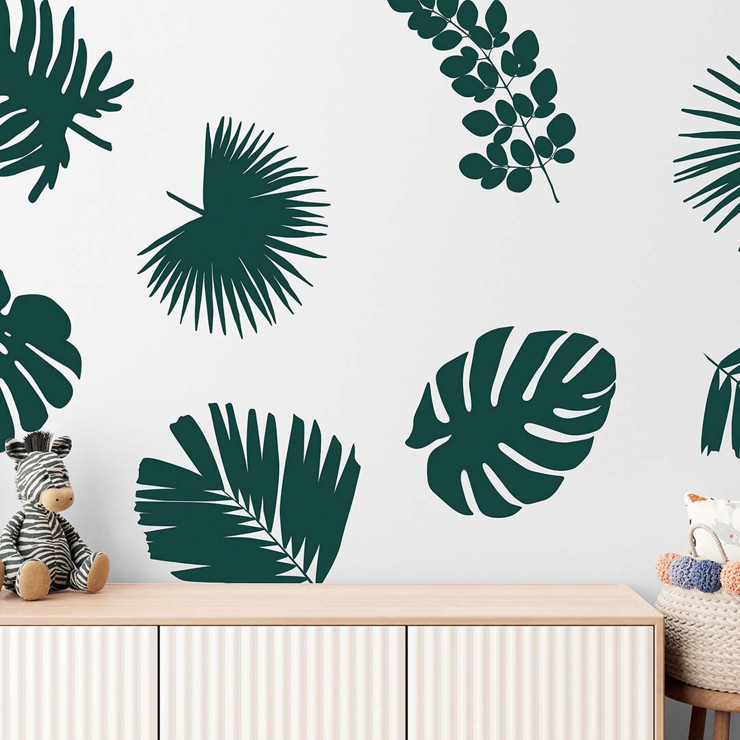 Tempaper's Graphic Palm Leaf Wall Decals in a kid's bedroom behind a dresser.